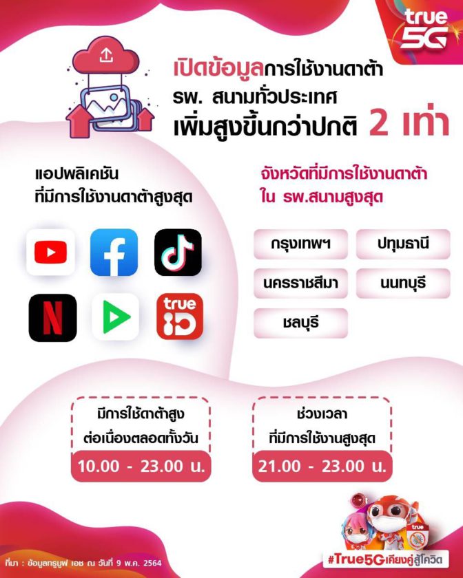 กลุ่มทรู เผยขยายสัญญาณสื่อสาร ทรู 5G 4G WiFi ไปยังโรงพยาบาลสนามแล้ว 144 แห่งทุกภาคทั่วไทย รวมทั้งล่าสุดติดตั้งอุปกรณ์ AP (Access Point) กระจายสัญญาณ Wireless รวมกว่า 300 ตัวเฉพาะที่รพ.สนาม อิมแพค เมืองทองธานี เตรียมพร้อมรองรับการใช้งานสื่อสารไร้สายของผู้ป่วย 5,200 เตียง พร้อมเปิดคอลล์ เซ็นเตอร์เฉพาะกิจ โทร. 02-700-9022 รับแจ้งดูแลปัญหาบริการและเครือข่ายรพ.สนามอย่างใกล้ชิดในช่วงวิกฤตินี้ ชี้ตัวเลขการใช้งานดาต้าเพิ่มสูงขึ้นจากช่วงปกติอย่างเห็นได้ชัดถึง 2 เท่า โดยมีข้อมูลจากทีมเน็ตเวิร์คที่มอนิเตอร์ดูแลคุณภาพการใช้งานเครือข่ายของโรงพยาบาลสนามตลอด 24 ชั่วโมง พบว่าปริมาณการใช้งานดาต้าสูงต่อเนื่องตลอดทั้งวัน ตั้งแต่เวลา 10.00 – 23.00 น. และมีช่วงใช้งานสูงสุดระหว่างเวลา 21.00 – 23.00 น. สำหรับแอปพลิเคชันที่มีการใช้งานดาต้าสูงสุด 6 อันดับแรก ได้แก่ YouTube, TikTok, Facebook, Netflix, LineTV และTrueID ขณะที่รพ.สนามในจังหวัดที่มีการใช้งานดาต้าสูงสุด 5 อันดับแรกได้แก่ กรุงเทพ, ปทุมธานี, นครราชสีมา, นนทบุรี และชลบุรี