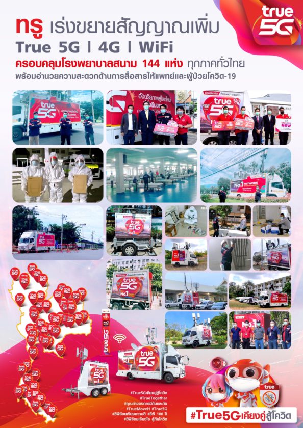 คุณมนัสส์ มานะวุฒิเวช กรรมการผู้จัดการใหญ่ (ร่วม) บมจ. ทรู คอร์ปอเรชั่น กล่าวว่า “ สถานการณ์การแพร่ระบาดของโควิด-19 ระลอก 3 ของไทยครั้งนี้ มีผู้ป่วยที่ติดเชื้อจำนวนมากต้องเข้ารับการรักษาในโรงพยาบาลสนามทั่วประเทศ ซึ่งการใช้ชีวิตภายในรพ. สนามนั้น ทั้งบุคลากรทางการแพทย์ และผู้ติดเชื้อจำเป็นอย่างยิ่งที่จะต้องสื่อสารได้อย่างต่อเนื่องและมีประสิทธิภาพเต็มที่ กลุ่มทรูจึงเร่งเสริมทัพทีมวิศวกรเพิ่มสัญญาณอินเทอร์เน็ตความเร็วสูง ทั้งเดินสายไฟเบอร์ ติดตั้งรถโมบายล์ทรูมูฟ เอช (COW-Cell on Wheel) ขยายขีดความสามารถรองรับการใช้งานของเครือข่ายทั้ง True 5G, 4G, WiFi โดยขณะนี้ได้ดูแลขยายเพิ่มสัญญาณไปยังโรงพยาบาลสนามแล้ว 144 แห่งทั่วไทย และจากการเฝ้าระวังการใช้งานเครือข่ายให้มีคุณภาพอย่างต่อเนื่องของทีมงานทรู พบว่ามีปริมาณการใช้งานดาต้าเพิ่มขึ้นต่อเนื่องมากกว่าปกติถึง 2 เท่า ตลอดทั้งวัน และใช้งานมากสุดช่วงเวลา 21.00-23.00 น. โดยส่วนใหญ่ผู้ป่วยในรพ.สนาม เป็นผู้ติดเชื้อที่มีอาการไม่รุนแรง จึงมีการใช้โซเชี่ยลแอปสื่อสารกับครอบครัว ติดตามข่าวสารสังคมภายนอก และลดความเครียดระหว่างการพักรักษาตัวด้วยคอนเทนต์บันเทิง ซึ่งก็สอดคล้องกับความตั้งใจของกลุ่มทรูที่ต้องการดูแลคนไทยทุกกลุ่ม รวมทั้งกลุ่มผู้ป่วยในรพ.สนาม ที่ต้องการการผ่อนคลาย จึงได้มอบบริการ “ทรูวิชั่นส์ นาว” – TrueVisions NOW ให้รับชมทรูวิชั่นส์ได้ทันทีผ่านสมาร์ทโฟน บนแอปพลิเคชันทรูไอดี ฟรีตลอดช่วงเวลากักตัว รวมทั้งอำนวยความสะดวกให้กลุ่มผู้ป่วยได้ติดต่อสื่อสารกับครอบครัวให้คลายความกังวล จึงมีการติดตั้งอุปกรณ์ AP เพื่อกระจายสัญญาณ Wireless ให้ครอบคลุมในพื้นที่เพื่อให้สามารถใช้งานได้กับมือถือทุกเครือข่าย โดยเฉพาะ ล่าสุดที่รพ.สนาม อิมแพค เมืองทองธานี ทรูได้มีการขยายสัญญาณสื่อสาร 5G WiFi และติดตั้ง AP รวมกว่า 300 ตัว เพื่อให้ครอบคลุมทั่วทุกพื้นที่ของอิมแพคพร้อมรองรับเตียงสนามได้ 5,200 เตียงอย่างแน่นอน อีกทั้งหากรพ.สนาม มีปัญหาในด้านเครือข่ายสัญญาณหรือบริการ ก็สามารถติดต่อแจ้งได้ที่คอลล์เซ็นเตอร์เฉพาะกิจ โทร. 02-700-9022