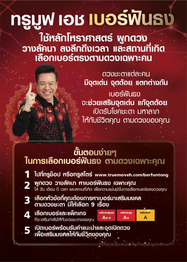 ลูกค้าที่สนใจ “ทรูมูฟ เอช เบอร์ฟันธง” สามารถเลือกเบอร์ฟันธงพร้อมรับคำแนะนำเปิดดวงชะตาได้แล้ววันนี้ ที่ทรู ช็อปทุกสาขาทั่วประเทศ และทรูสโตร์ http://www.truemoveh.com/berfuntong จนถึง 31 ธันวาคม 2564