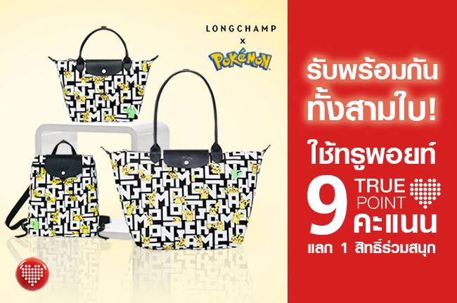 ลูกค้าทรูร่วมกิจกรรมง่ายๆ แค่ใช้ 9 ทรูพอยท์ แลกรับ 1 สิทธิ์ร่วมสนุก แลกสิทธิ์ได้ไม่จำกัด เพื่อเป็นเจ้าของกระเป๋า Longchamp x Pokémon Collection พร้อมกัน 3 ใบ แบบครบเซ็ท จำนวน 1 รางวัล ประกอบด้วยรุ่น LE PLIAGE COLLECTION POKEMON TOP HANDLE BAG S, LE PLIAGE COLLECTION POKEMON SHOULDER BAG L และ LE PLIAGE COLLECTION POKEMON BACKPACK และตุ๊กตาพิคาชู จำนวน 10 รางวัล ร่วมกิจกรรมได้ตั้งแต่ 1 – 30 ธันวาคม 2563 ทางแอปทรูไอดี และเว็บไซต์ทรูไอดีเท่านั้น หรือคลิก