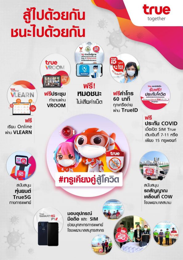 ขณะเดียวกัน กลุ่มทรูประกาศเดินหน้าเคียงคู่คนไทย นำศักยภาพด้านดิจิทัลเทคโนโลยีสื่อสารภายในกลุ่มทรู ร่วมสนับสนุนภารกิจสู้ภัยโควิด-19 ของทุกภาคส่วน รวมทั้งเป็นกำลังใจให้คนไทยทุกกลุ่มอย่างต่อเนื่อง โดยเฉพาะกับประชาชนชาวไทย นอกเหนือจาก