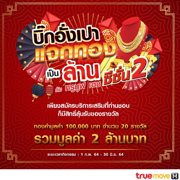 เฮงๆ รวยๆ ต้อนรับตรุษจีน ทรูมูฟ เอช จับมือ 4 พันธมิตร ได้แก่ ซัมวัน, ไอ-สปอร์ต, พร็อพเทค และเซเวนตี้ คาแรคเตอร์ส จัดแคมเปญแจกทองล้านต่อเนื่องรับตรุษจีน “บิ๊กอั่งเปา แจกทองเป็นล้าน กับ ทรูมูฟ เอช ซีซั่น 2” แจกทองคำมูลค่า 100,000 บาท 20 รางวัล บัตรเติมเงินมูลค่า 300 – 500 บาท กว่า 600 รางวัล รวมมูลค่าทั้งสิ้น 2,270,000 บาท เพียงสมัคร SMS รับบริการเสริมบริการดูดวง และลงทะเบียนร่วมสนุก* ตั้งแต่วันนี้ – 30 มิถุนายน 2564