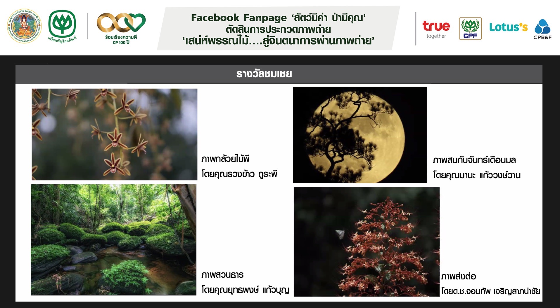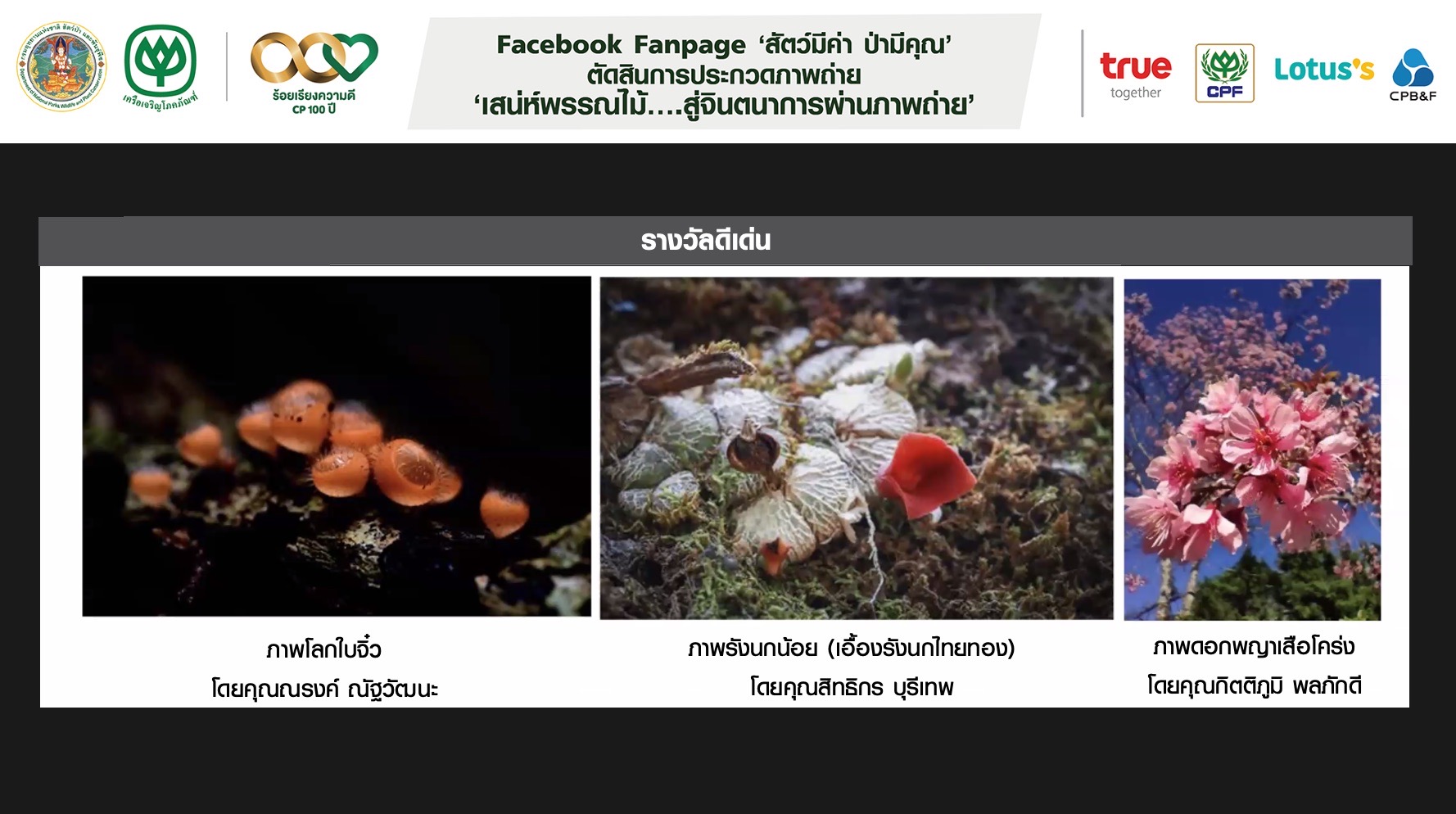 ผ่านเฟซบุ๊กแฟนเพจ ‘สัตว์มีค่า ป่ามีคุณ’ ครั้งที่ 1 ประจำปี 2565 หัวข้อ ‘เสน่ห์พรรณไม้…สู่จินตนาการผ่านภาพถ่าย’ ผ่านระบบออนไลน์ ภายใต้โครงการปลูกจิตสำนึกอนุรักษ์ธรรมชาติและสิ่งแวดล้อม การประกวดภาพถ่าย ‘สัตว์มีค่า ป่ามีคุณ’