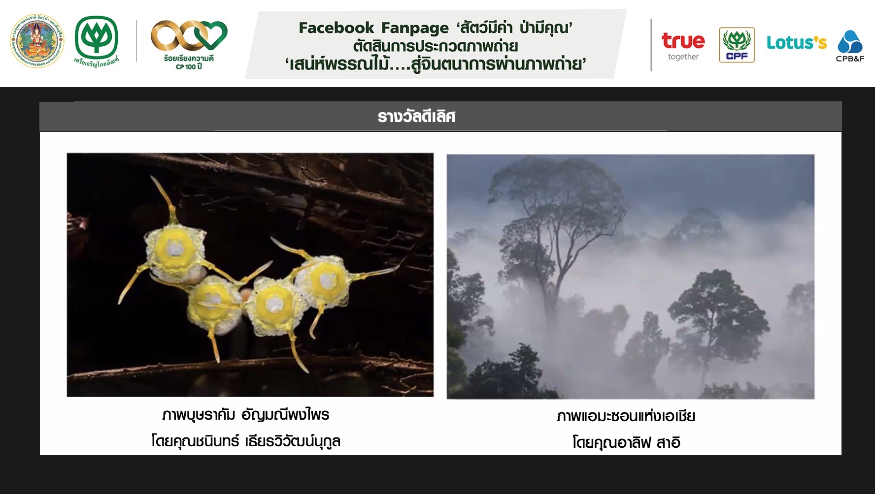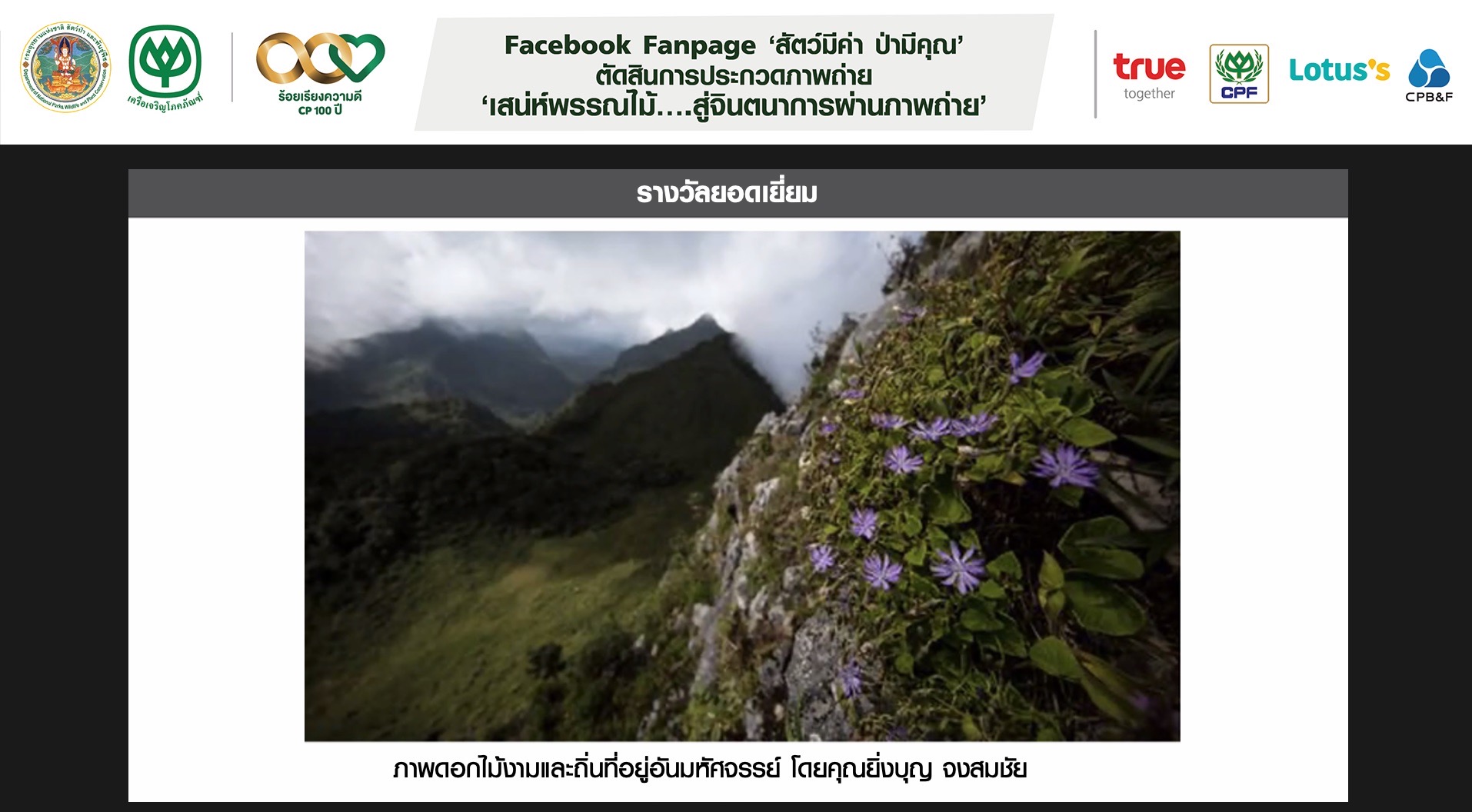 ผ่านเฟซบุ๊กแฟนเพจ ‘สัตว์มีค่า ป่ามีคุณ’ ครั้งที่ 1 ประจำปี 2565 หัวข้อ ‘เสน่ห์พรรณไม้…สู่จินตนาการผ่านภาพถ่าย’ ผ่านระบบออนไลน์ ภายใต้โครงการปลูกจิตสำนึกอนุรักษ์ธรรมชาติและสิ่งแวดล้อม การประกวดภาพถ่าย ‘สัตว์มีค่า ป่ามีคุณ’