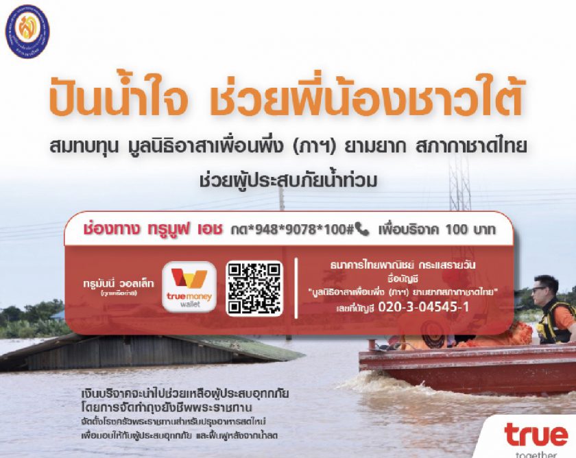 ร่วมปันน้ำใจช่วยพี่น้องชาวใต้ ด้วยการบริจาคสมทบทุนให้มูลนิธิอาสาเพื่อนพึ่ง(ภาฯ) ยามยาก สภากาชาดไทย
