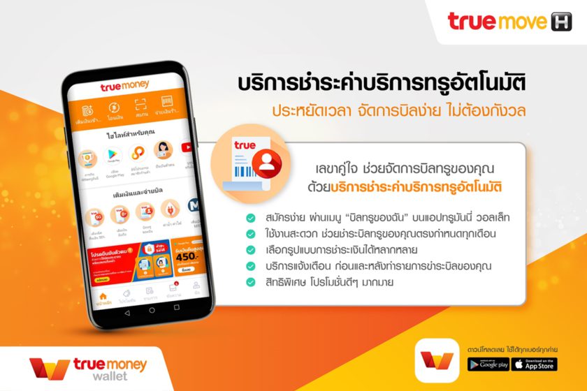 ดูวิธีการสมัครและรายละเอียดเพิ่มเติมได้ที่ https://www.truemoney.com/a/truebill-pro031/ สอบถามเพิ่มเติมได้ที่ ทรู คอลเซ็นเตอร์ โทร 1242 หรือทรูช็อป ทุกสาขาทั่วประเทศ