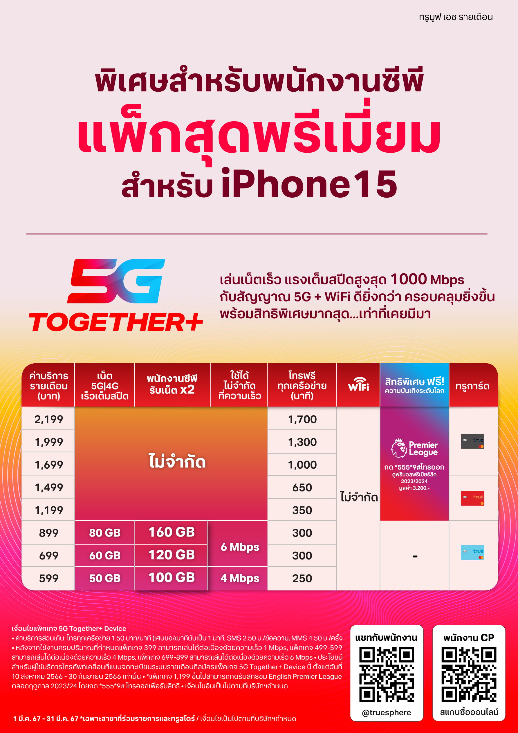 ไม่ต้องชำระค่าบริการล่วงหน้า พร้อมรับเน็ตคูณ 2 เมื่อสมัครแพ็กเกจ 5G Together+ 599-899
