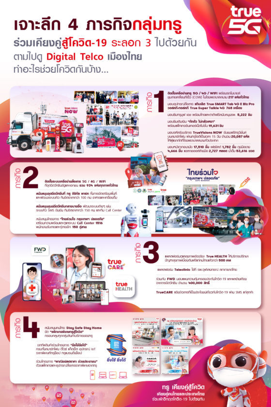 หากถามว่า องค์กรภาคเอกชนในภาคธุรกิจ Digital Telco ของไทย ทำอะไรที่จะช่วยฝ่าวิกฤตครั้งนี้ได้บ้าง ก็เป็นอีกหนึ่งมุมมองที่น่าสนใจ ว่าจะมีการนำศักยภาพที่มีอยู่ ทั้งด้านการสื่อสาร ด้านเทคโนโลยีดิจิทัล ด้านนวัตกรรม รวมทั้งด้านบุคลากรที่มีอยู่ทั่วประเทศ มาสนับสนุนและช่วยเหลือ ร่วมเคียงบ่าเคียงไหล่คนไทยและประเทศไทยกันอย่างไรบ้าง อย่างที่เห็นภาพชัดเจนในวิกฤตระลอก 3 ครั้งนี้ ก็มี กลุ่มทรู บริษัทสื่อสารโทรคมนาคมไทย ที่เป็นอีกหนึ่งองค์กรเอกชนที่ดำเนินภารกิจสนับสนุนและช่วยเหลือคนไทยในทุกภาคส่วนอย่างชัดเจน