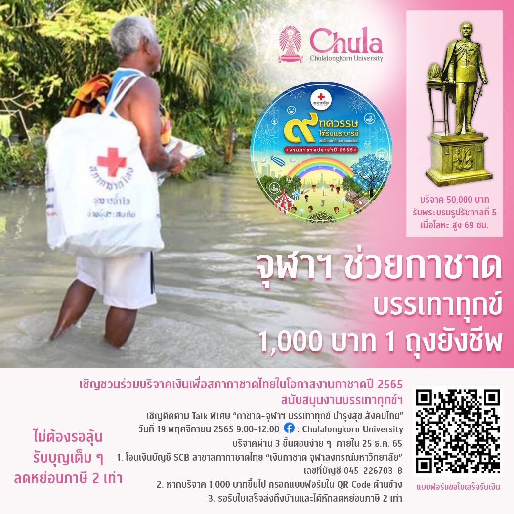 พร้อมกันนี้ เชิญติดตามชม Talk พิเศษ “กาชาด-จุฬาฯ บรรเทาทุกข์ บำรุงสุข สังคมไทย” ในวันสาร์ที่ 19 พฤศจิกายนนี้ เวลา 9:00 – 12:00 ทาง Facebook: Chulalongkorn University