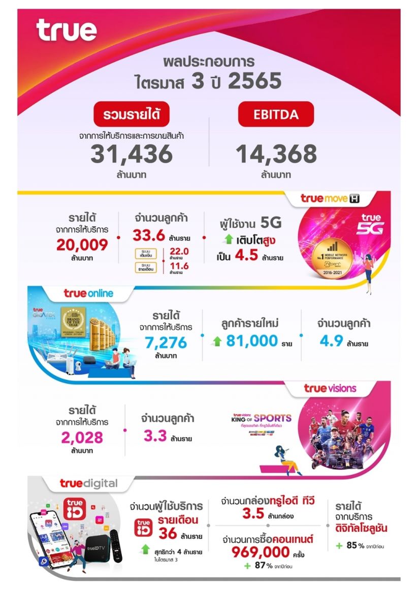 กลุ่มทรู รายงานผลประกอบการไตรมาส 3 ปี 2565 รายได้รวมจากการให้บริการและการขายสินค้าเติบโตร้อยละ 6.9 จากปีก่อน และร้อยละ 2.8 จากไตรมาสก่อนเป็น 31,436 ล้านบาท แม้จะได้รับผลกระทบจากสภาวะเศรษฐกิจโลกซึ่งกดดันทั้งภาคธุรกิจและกำลังซื้อของผู้บริโภค รวมถึงต้นทุนด้านพลังงานที่ปรับตัวเพิ่มขึ้น แต่กลุ่มทรูยังสามารถเพิ่มประสิทธิภาพการบริหารต้นทุนได้อย่างต่อเนื่อง ส่งผลให้กำไรจากการดำเนินงานก่อนหักดอกเบี้ย ภาษี ค่าเสื่อมราคา และค่าตัดจำหน่าย (EBITDA) และอัตรา EBITDA margin ต่อรายได้จากการให้บริการ ปรับตัวดีขึ้นจากไตรมาสก่อนเป็น 14,368 ล้านบาทและร้อยละ 55 ตามลำดับ