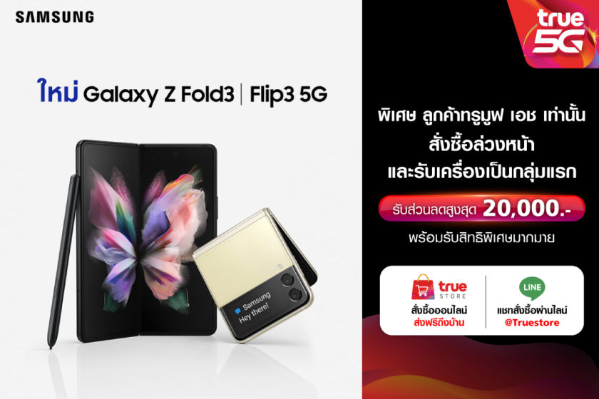 ทรู 5G ชวนสาวกซัมซุงล้ำก่อนใคร!!! มอบสิทธิพิเศษสุดเฉพาะลูกค้าทรูมูฟ เอช แบบรายเดือน อายุการใช้งานนาน 1 ปีขึ้นไป สามารถจองและเป็นเจ้าของ Samsung Galaxy Z Fold3 I Flip3 5G ได้เป็นกลุ่มแรก สัมผัสสมาร์ทโฟนหน้าจอพับได้ นวัตกรรมสุดล้ำจากซัมซุง ผสานสุดยอดประสิทธิภาพการใช้งานบนเครือข่ายอัจฉริยะ ทรู 5G ที่เร็วกว่า แรงกว่า รายแรก รายเดียว ที่ครบสุดทุกย่านความถี่ พบข้อเสนอสุดเร้าใจมากมาย ทั้งส่วนลดสูงสุดถึง 20,000 บาท ราคาที่ดีที่สุดที่เดียวเท่านั้น! ซื้อ Samsung Galaxy Flip3 5G ราคาเริ่มต้น 15,900 บาท และ Samsung Galaxy Fold 3 5G ราคาเริ่มต้น 37,900 บาท เมื่อสมัครแพ็กเกจ 5G Ultra Max Speed Plus 1,399 นาน 24 เดือน โดยไม่ต้องชำระค่าบริการล่วงหน้า พร้อมรับของแถมแบบจัดเต็ม ได้แก่ Case Cover with S-pen มูลค่า 2,790 บาท (เมื่อซื้อ Samsung Galaxy Z Fold3 5G) หรือ Silicone Case with Ring (สีกรมท่า) มูลค่า 1,190 บาท (เมื่อซื้อ Samsung Galaxy Z Flip3 5G), ดูฟรี! ทรูพรีเมียร์ลีก ตลอดฤดูกาล 2021/22 เมื่อสมัครแพ็กเกจ 1,199 บาท ขึ้นไป, True 5G Cloud Gaming มูลค่า 299 บาท นาน 1 เดือน, บัตรกำนัล Lazada มูลค่า 2,000 บาท, รับเอกสิทธิ์พิเศษ Samsung Care + และบริการผู้ช่วยส่วนตัว Galaxy Butler Gold นาน 1 ปี เปิดจองตั้งแต่วันที่ 13 – 22 สิงหาคมนี้ ที่เว็บไซต์ทรูสโตร์ www.truemoveh.com/onlinestore และ Line @Truestore รับเครื่องได้ตั้งแต่วันที่ 2 กันยายน เป็นต้นไป