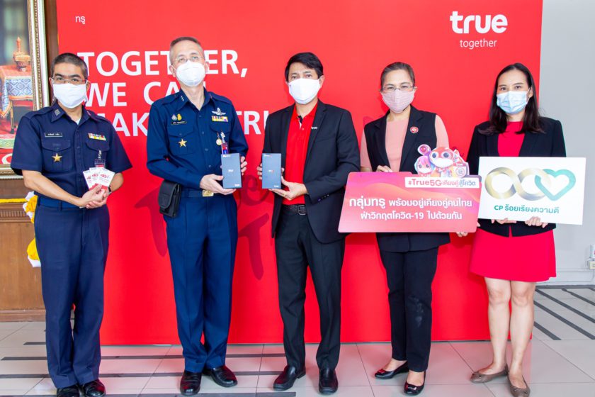 เพื่ออำนวยความสะดวกด้านการสื่อสารในศูนย์ประสานผู้ป่วยโควิด-19 กองทัพอากาศ กรมแพทย์หารอากาศ โดย พลอากาศโท ธนวิตต สกุลแสงประภา (ที่ 2จากซ้าย) เจ้ากรมแพทย์ รับมอบการสนับสนุนด้านการสื่อสาร จากกลุ่มทรู โดย นายสหรัฐส์ คนองศิลป์ (กลาง) ผู้อำนวยการบริหาร ด้านการบริหารจัดการระดับภูมิภาค กรุงเทพฯ และปริมณฑล ทั้งสมาร์ทโฟน True SMART 4G P1 จำนวน 10 เครื่อง พร้อมซิมโทรฟรีทุกเครือข่าย เน็ตไม่อั้น นาน 1 ปี สำหรับแพทย์ พยาบาล และบุคลากรทางการแพทย์ประจำศูนย์ดังกล่าว ใช้ประสานงานติดตามอาการผู้ป่วยติดเชื้อที่เข้ารับการรักษาพยาบาลแบบกักตัว อยู่ที่บ้าน โดยใช้การโทรหรือการส่งข้อมูลร่วมกับระบบบริการการแพทย์ทางไกล (A/MED Telehealth)