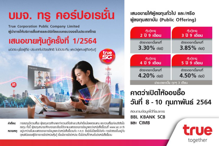 ทรู คาดเปิดให้จองซื้อหุ้นกู้ครั้งที่ 1/2564 วันที่ 8-10 กุมภาพันธ์ 2564 เตรียมเสนอขายแก่ผู้ลงทุนทั่วไป 4 ชุด ดอกเบี้ยคงที่ 3.30-4.50% ต่อปี