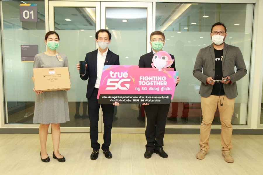 โรงพยาบาลรามาธิบดีจักรีนฤบดินทร์ โดย อ.นพ.ไพโรจน์ บุญคงชื่น (ที่ 2 จากขวา) ผู้อำนวยการโรงพยาบาลฯ รับมอบ 5G AR Glasses และสมาร์ทโฟน Hauwei รุ่น Mate 30 จาก กลุ่มทรู ผู้นำเครือข่ายอัจฉริยะ True 5G โดยมี คุณธวัชชัย ฤกษ์สำราญ (ที่ 2 จากซ้าย) รองผู้อำนวยการธุรกิจโมบายล์ และคณะกรรมการยุทธศาสตร์ 5G บมจ. ทรู คอร์ปอเรชั่น พร้อมด้วย พันธมิตร ฟินน์ โซลูชั่น โดย นายนพฤทธิ์ จักขุจัน (ขวาสุด) ผู้ก่อตั้ง และ กรรมการผู้จัดการบริษัท ฟินน์ โซลูชั่น จำกัด ณ อาคารศูนย์การเรียนรู้ สถาบันการแพทย์จักรีนฤบดินทร์ เพื่อใช้อำนวยความสะดวกในการรักษาผู้ป่วยทางไกลแบบ เรียลไทม์ ภาพคมชัด ประมวลผลรวดเร็ว วินิจฉัยตรงจุด และแม่นยำ ลดการสัมผัสกับผู้ป่วยโดยตรง