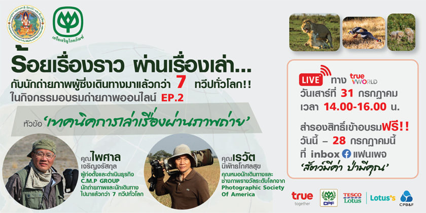 กรมอุทยานแห่งชาติ สัตว์ป่า และพันธุ์พืช ร่วมกับ เครือเจริญโภคภัณฑ์ และ กลุ่มทรู ขอเชิญผู้สนใจและชื่นชอบการถ่ายภาพเข้าร่วมเรียนรู้ทริคใหม่ๆ กับการอบรมออนไลน์ผ่าน True VROOM ในหัวข้อ ‘เทคนิคการเล่าเรื่องผ่านภาพถ่าย’ เปิดมุมมองการถ่ายภาพให้มีเรื่องเล่า พร้อมเทคนิคที่น่าสนใจจาก นายไพศาล เจริญจรัสกุล ผู้มีประสบการณ์เดินทางถ่ายภาพมาแล้ว 7 ทวีปทั่วโลก และ นายเรวัต นิพัทธโกศลสุข ช่างภาพรางวัลระดับโลกจาก Photographic Society of America ผ่าน True VROOM พร้อมกันในวันเสาร์ที่ 31 กรกฎาคม 2564 เวลา 14.00 – 16.00 น. สำรองสิทธิ์เข้าร่วมอบรมออนไลน์ฟรี!! ตั้งแต่วันนี้ – 28 กรกฎาคมนี้ ที่อินบอกซ์เฟซบุ๊กแฟนเพจ ‘สัตว์มีค่า ป่ามีคุณ’ เปิดรับจองสิทธิ์เพียง 100 คนเท่านั้น โดยจัดส่งลิงค์สำหรับเข้าร่วมกิจกรรมให้ทั้ง 100 คน ภายในวันที่ 29 กรกฎาคมนี้