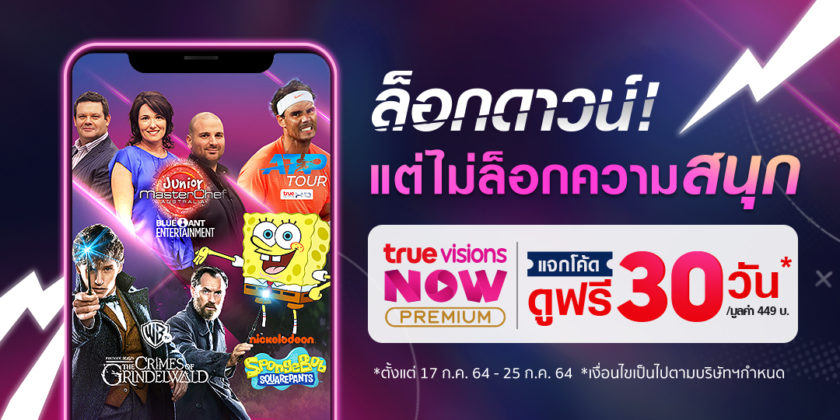 จากมาตรการล็อกดาวน์ที่เข้มงวดขึ้นในช่วงนี้ ทรูวิชั่นส์ มีความห่วงใยคนไทยทุกคน จึงได้จัดแคมเปญ “TrueVisions NOW: ล็อกดาวน์! แต่ไม่ล็อกความสนุก” มอบสิทธิ์ชมฟรี TrueVisions NOW Premium บริการสตรีมมิ่งคอนเทนต์ระดับพรีเมียมจากทรูวิชั่นส์ นาน 30 วัน (มูลค่า 449 บาท) จำนวน 90,000 สิทธิ์ เพื่อช่วยให้คนไทยได้คลายความกังวล และผ่อนคลายขึ้น ด้วยบริการ TrueVisions NOW Premium ชมสตรีมมิ่งคอนเทนต์ระดับพรีเมียมจากทั่วโลก สนุกฟินตลอด 24 ชั่วโมง ได้ทุกที่ ทุกเวลา ผ่านทรูไอดี ทั้งแอปพลิเคชัน เว็บไซต์ และกล่องทรูไอดี ไม่พลาดทุกรายการกีฬาสดระดับโลก อาทิ บาสเก็ตบอล NBA, NFL, กอล์ฟเวิลด์ทัวร์, เทนนิส ภาพยนตร์ไทยและต่างประเทศ ซีรีส์ดัง การ์ตูนฮิต วาไรตี้บันเทิง และสารคดี รวม 3,000 รายการ เต็มอิ่มกับความบันเทิงจาก 38 ช่องพรีเมี่ยมของทรูวิชั่นส์ และอีก 60 ช่องรายการดัง