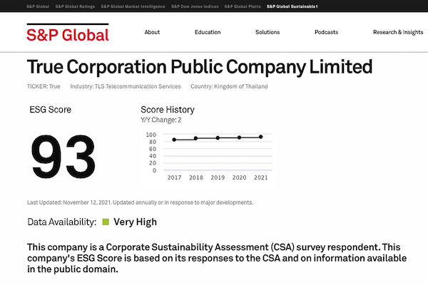 S&P Global ผู้ให้บริการข้อมูลด้านการเงินและการจัดอันดับความน่าเชื่อถือระดับโลก ประกาศรายชื่อองค์กรชั้นนำที่เป็นสมาชิกดัชนีความยั่งยืนดาวโจนส์ 2021 และได้รับการบันทึกในรายงาน The Sustainability Yearbook 2022 โดยกลุ่มทรู ภูมิใจอย่างยิ่งที่ได้สร้างชื่อให้แก่ประเทศอีกครั้ง ผงาดเป็นองค์กรไทยที่ได้คะแนนรวม DJSI 2021 สูงสุดถึง 93 คะแนน ขึ้นเป็นอันดับ 1 จากองค์กรทั้งหมดใน 61 อุตสาหกรรมทั่วโลก และติดอันดับ Top Gold Class ถึง 4 ปีซ้อนในอุตสาหกรรมโทรคมนาคม ตอกย้ำความโดดเด่นในการดำเนินธุรกิจและพัฒนาองค์กรให้เติบโตอย่างยั่งยืนตามยุทธศาสตร์ภายใต้กรอบ 3 H’s : Heart Health Home เป็นที่ยอมรับในระดับสากล