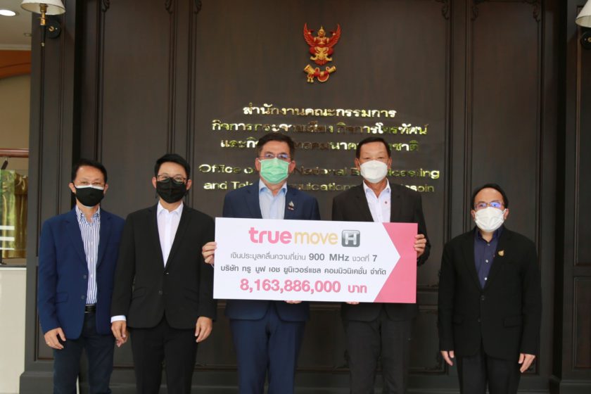 กรุงเทพฯ 31 มีนาคม 2565 – สำนักงานคณะกรรมการกิจการกระจายเสียง กิจการโทรทัศน์ และกิจการโทรคมนาคมแห่งชาติ โดย พล.อ.สุกิจ ขมะสุนทร (ที่2จากขวา) ประธานคณะกรรมการ พร้อมด้วย คณะผู้บริหาร กสทช. ร่วมรับมอบเงินค่าประมูลคลื่นความถี่สำหรับกิจการโทรคมนาคมย่าน 900 MHz คลื่นความถี่ 905 – 915 MHz / 950 – 960 MHz งวดที่ 7 ที่ได้จัดสรรไปเมื่อวันที่ 16 มีนาคม 2559 จาก บริษัท ทรูมูฟ เอช ยูนิเวอร์แซล คอมมิวนิเคชั่น จำกัด โดย นายจักรกฤษณ์ อุไรรัตน์ (กลาง) หัวหน้าคณะผู้บริหาร ด้านรัฐกิจสัมพันธ์ บมจ. ทรู คอร์ปอเรชั่น จำนวน 8,163.886 ล้านบาท (รวมภาษีมูลค่าเพิ่มแล้ว) พร้อมกับหลักประกันการชำระเงินค่าคลื่นความถี่ในส่วนที่เหลือวงเงินจำนวน 24,491.658 ล้านบาท (รวมภาษีมูลค่าเพิ่มแล้ว) ตามเงื่อนไขการรับใบอนุญาต โดยกลุ่มทรู มุ่งมั่นยกระดับเครือข่ายทรูมูฟ เอช เพื่อคนไทย จัดเต็มสัญญาณให้ครอบคลุม 77 จังหวัดทั่วประเทศ แรงกว่า ครบกว่า ด้วยคลื่น 7 ย่านความถี่ มากที่สุดในไทย พร้อมตอบโจทย์ทุกดิจิทัลไลฟ์สไตล์ได้อย่างลงตัว