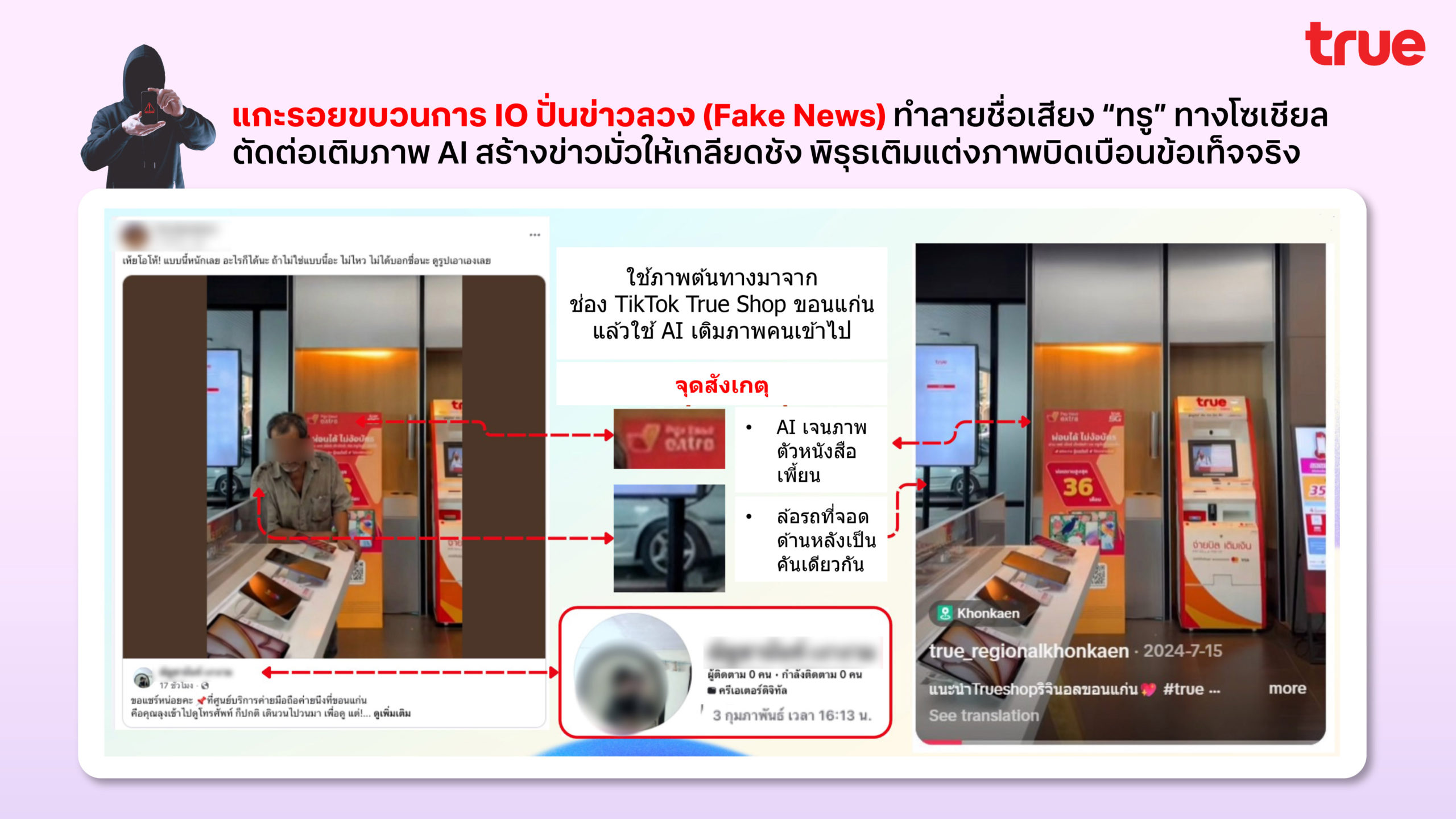 นายจักรกฤษณ์ อุไรรัตน์ หัวหน้าคณะผู้บริหารด้านรัฐกิจสัมพันธ์ บมจ.ทรู คอร์ปอเรชั่น กล่าวว่า “การใช้สื่อสังคมออนไลน์ควรตั้งอยู่บนพื้นฐานของความรับผิดชอบ และเป็นไปอย่างสร้างสรรค์ ไม่ควรถูกใช้เป็นเครื่องมือในการเผยแพร่ข้อมูลที่บิดเบือนหรือไม่เป็นความจริง ซึ่งอาจก่อให้เกิดความเข้าใจผิดในสังคม การนำเข้าข้อมูลที่มีลักษณะบิดเบือนข้อเท็จจริงและสร้างความเข้าใจคลาดเคลื่อนต่อสาธารณะ เป็นการกระทำที่บริษัทฯ ไม่อาจยอมรับได้ ทั้งนี้ การนำเข้าข้อมูลอันเป็นเท็จเข้าสู่ระบบคอมพิวเตอร์ เข้าข่ายความผิดตามกฎหมายที่เกี่ยวข้อง บริษัทฯ จะดำเนินการทางกฎหมายอย่างถึงที่สุด เพื่อปกป้องสิทธิขององค์กร ลูกค้า และผู้มีส่วนได้เสียทุกฝ่าย ขอความร่วมมือชาวโซเชียลใช้วิจารณญาณในการรับข้อมูลข่าวสาร และหลีกเลี่ยงการส่งต่อข้อมูลที่อาจเป็นเท็จ”