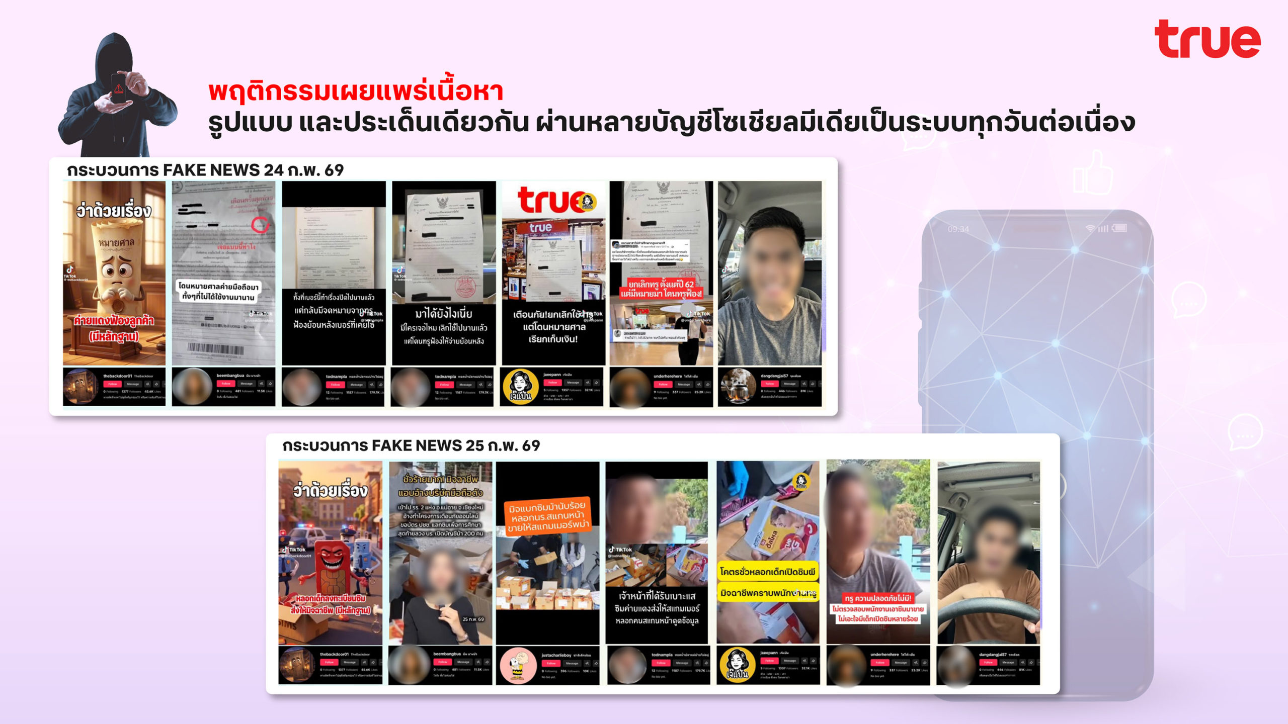 27 กุมภาพันธ์ 2569 – ทรู คอร์ปอเรชั่น ได้ดำเนินการแจ้งความต่อตำรวจไซเบอร์ 1 (บก. สอท.1) และ ก่อนหน้านี้ซึ่งได้ดำเนินการแจ้งความต่อสถานีตำรวจนครบาลห้วยขวางเพื่อให้ดำเนินคดีอาญากับผู้ใช้บัญชี TikTok ชื่อ “@thebackdoor01” และบัญชี Facebook ชื่อ “The Backdoor” ผู้ใช้บัญชี TikTok ชื่อ “@thebackdoor01”, “rairai9825” หรือ “ไรเหยอ?”, “underherehere ใต้โต๊ะเฮีย” หรือ “ไรเหยอ?”, “พีท ภาคิน – Pete Phakin” “jaeepann เจ๊แป้น”, “vvifilthailand ไวไฟ”, “dangdangjai57 จุดเดือด”, “plamchokchai ปาล์ม โชคชัย”, “Todnampla ทอดน้ำปลาแม่บ้านไม่อยู่”,และบัญชี Facebook ชื่อ “พีท ภาคิน – Pete Phakin” และเจ๊แป้น กรณีเผยแพร่โพสต์ และคลิปวิดีโอหลายชุดที่มีเนื้อหาบิดเบือนและเป็นข้อมูลอันเป็นเท็จเกี่ยวกับการให้บริการของบริษัทฯ