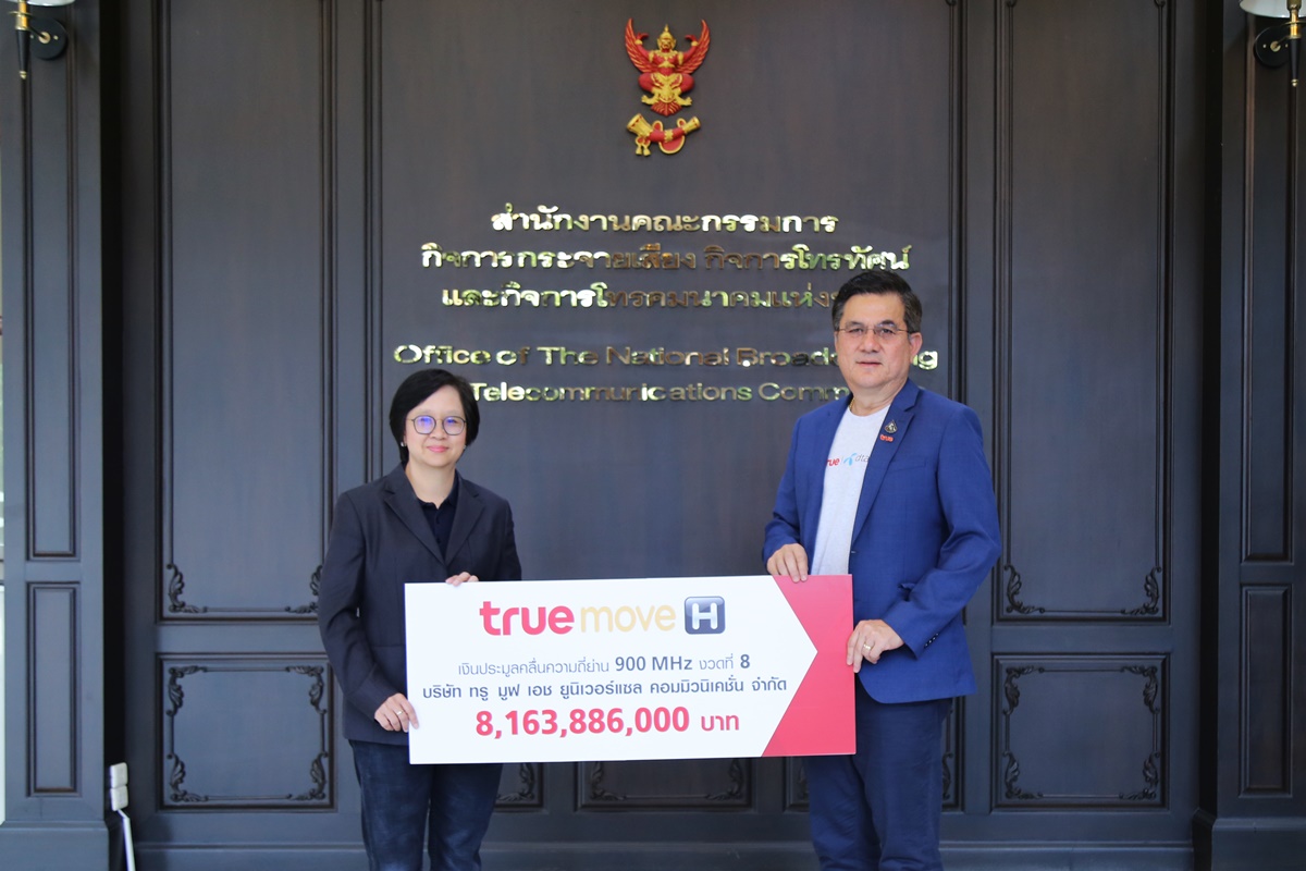กรุงเทพฯ 31 มีนาคม 2566 – สำนักงานคณะกรรมการกิจการกระจายเสียง กิจการโทรทัศน์ และกิจการโทรคมนาคมแห่งชาติ โดย คุณสาวจิตสถา ศรีประเสริฐสุข ผู้ช่วยเลขาธิการ กสทช. สายงานกิจการโทรคมนาคม (ซ้าย) รับมอบเงินค่าประมูลคลื่นความถี่สำหรับกิจการโทรคมนาคมย่าน 900 MHz คลื่นความถี่ช่วง 905 – 915 MHz / 950 – 960 MHz งวดที่ 8 ที่ได้จัดสรรไปเมื่อวันที่ 16 มีนาคม 2559 จาก บริษัท ทรูมูฟ เอช ยูนิเวอร์แซล คอมมิวนิเคชั่น จำกัด โดย คุณจักรกฤษณ์ อุไรรัตน์ (ขวา) รักษาการหัวหน้าคณะผู้บริหาร ด้านกิจการองค์กร บมจ. ทรู คอร์ปอเรชั่น จำนวน 8,163.886 ล้านบาท (รวมภาษีมูลค่าเพิ่มแล้ว)