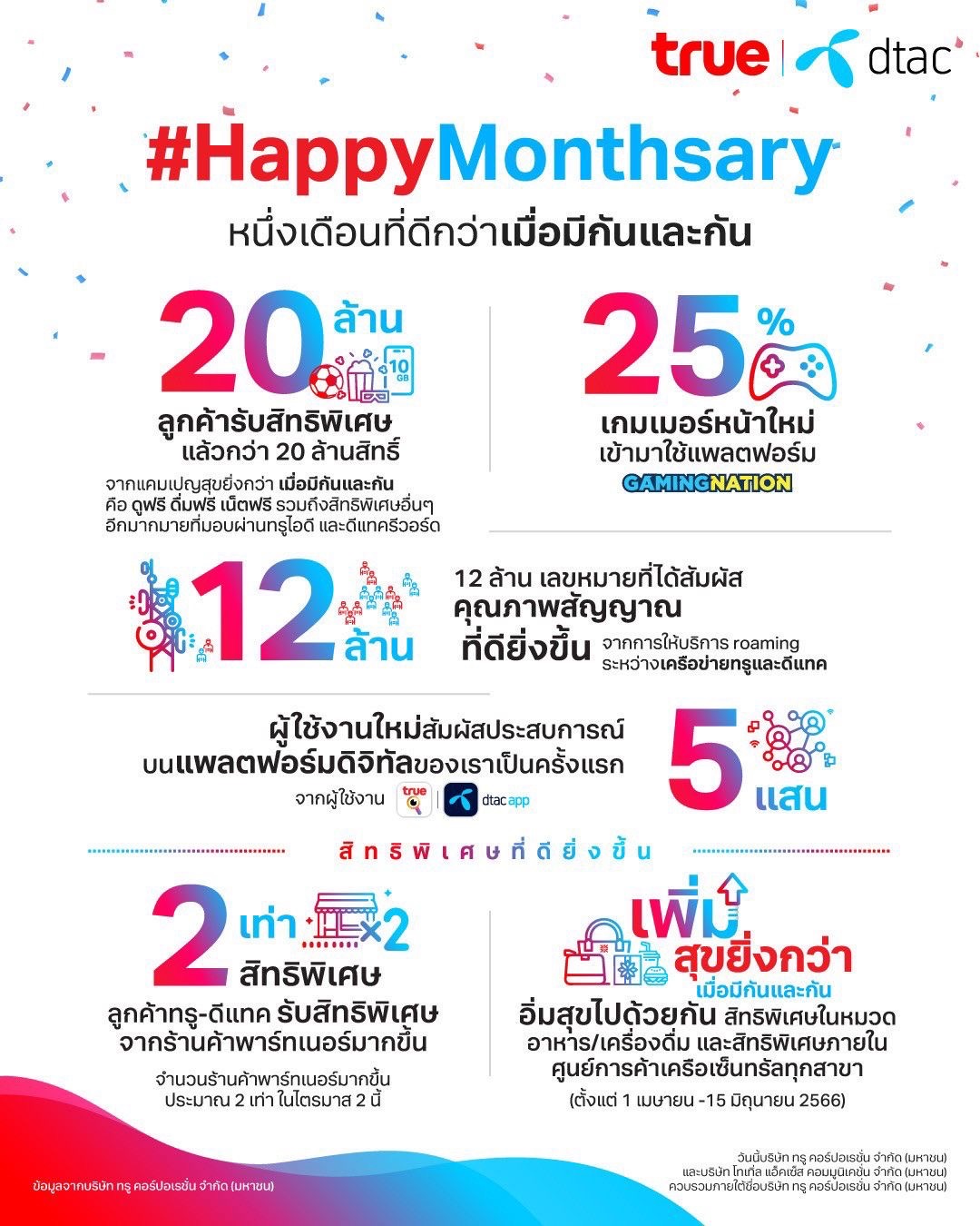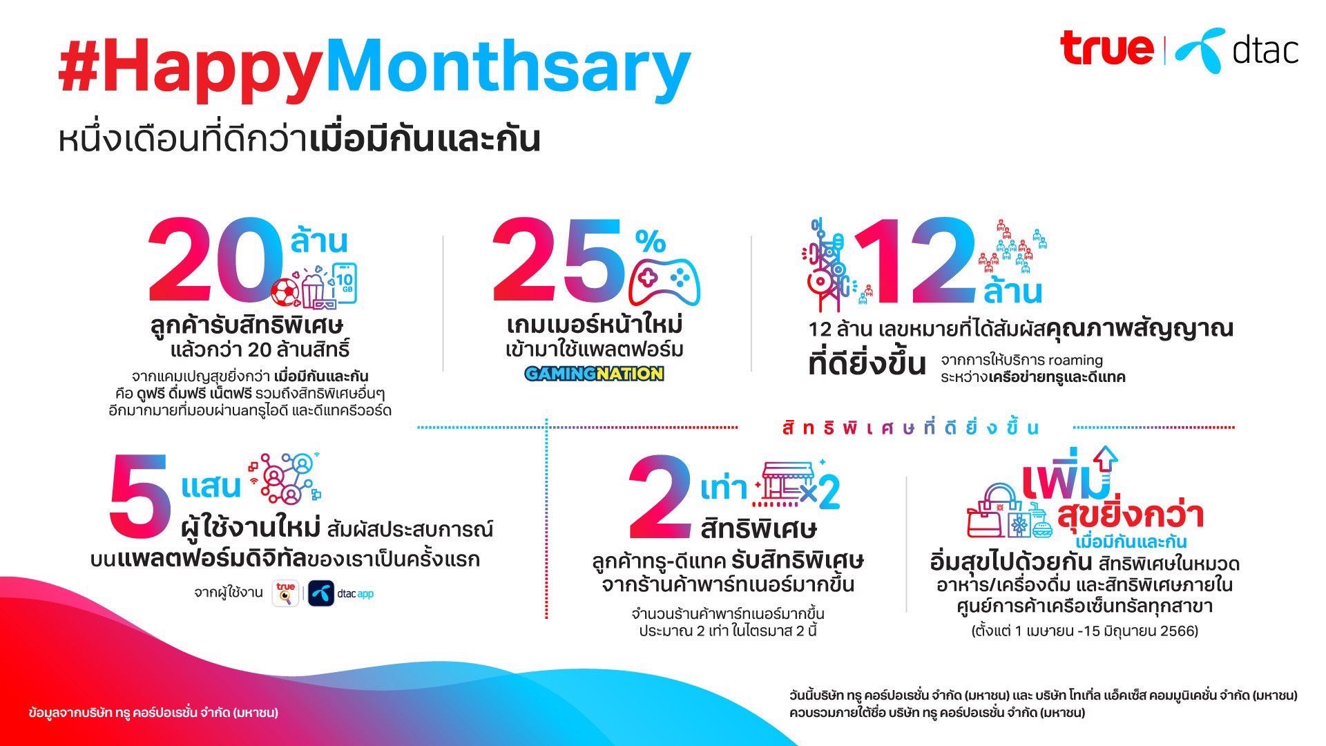 ทรู คอร์ปอเรชั่น เผย #HappyMonthsary รวมทรู-ดีแทค ลูกค้ารับสิทธิ์พุ่งกว่า 20 ล้านรายการ ยอดดิจิทัลแพลตฟอร์มโตกว่า 5 แสนราย 12 ล้านเลขหมายโรมมิ่ง