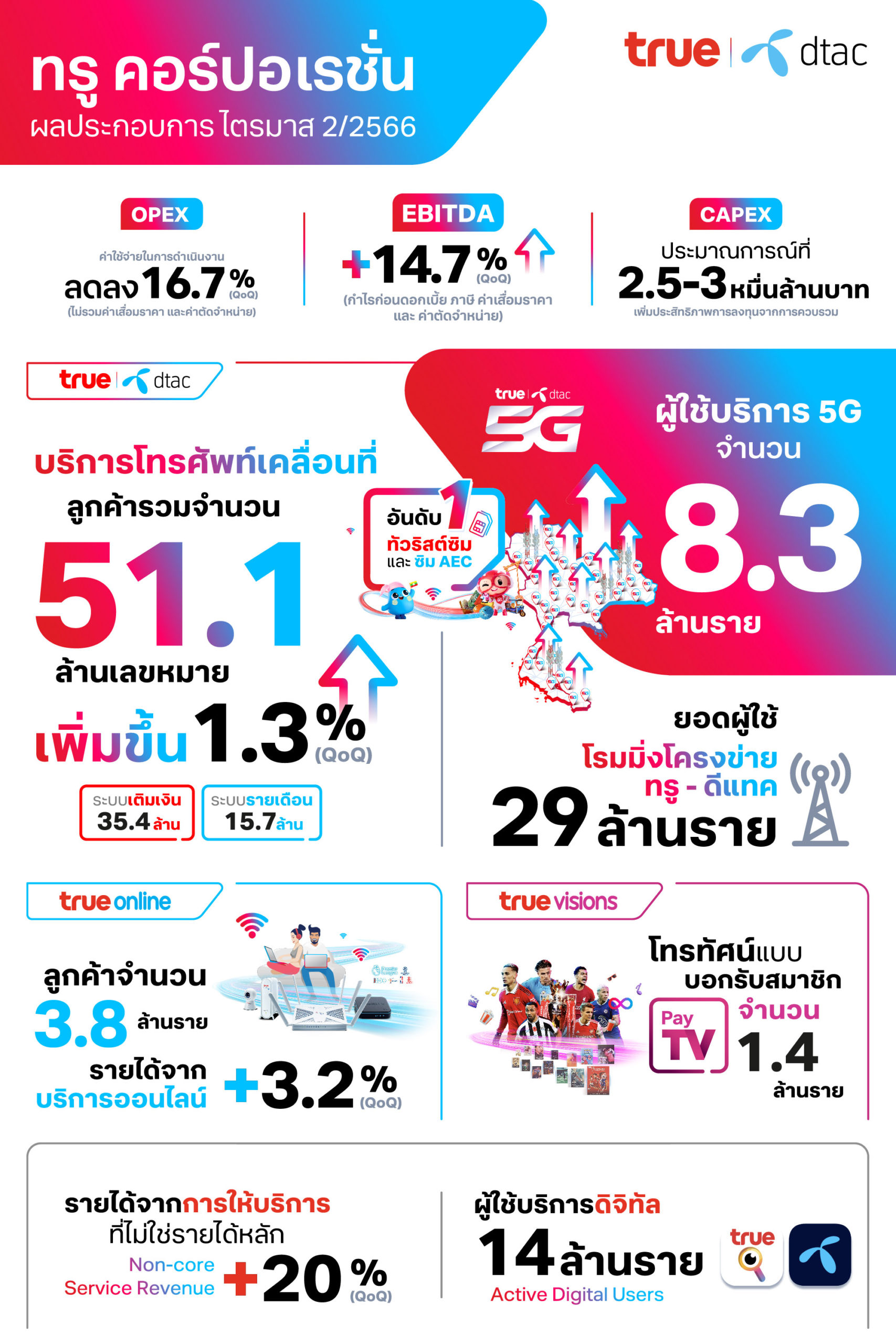 ค่าใช้จ่ายในการดำเนินงาน (OPEX) ทั้งหมด ไม่รวมค่าเสื่อมราคาและค่าตัดจำหน่าย (D&A) ลดลง 16.7% เทียบกับไตรมาสที่ผ่านมา (QoQ) จากมาตรการดำเนินการที่มีประสิทธิภาพอย่างต่อเนื่อง และการรับรู้ผลประโยชน์จากการควบรวมในระยะสั้น ในส่วน EBITDA สำหรับไตรมาสนี้ดีขึ้น 14.7% โดยเป็นผลจากรายได้จากการให้บริการที่เพิ่มขึ้น การลดค่าใช้จ่ายในการดำเนินงาน (OPEX) และผลกระทบเชิงบวกสุทธิจากการกลับรายการตั้งสำรองเนื่องมาจากการยุติข้อพิพาทในไตรมาส 1/2566 รายงานผลขาดทุนสุทธิหลังหักภาษีจำนวน 2,320 ล้านบาท ซึ่งได้รับผลกระทบจากผลกระทบที่เกิดขึ้นเพียงครั้งเดียว (one-time effect) จากการกลับรายการสินทรัพย์ภาษีเงินได้รอการตัดบัญชีของผลขาดทุนยกมาของ บริษัท ดีแทค ไตรเน็ต จำกัด หรือ DTN เนื่องจากความเป็นไปได้ในการปรับโครงสร้างธุรกิจภายใต้กลุ่มบริษัท และค่าใช้จ่ายเพื่อให้ได้มาซึ่งประโยชน์จากการควบรวม (Integration cost) จำนวนประมาณ 250 ล้านบาท โดยขาดทุนสุทธิยังได้รับผลกระทบจากค่าเสื่อมราคาและค่าตัดจำหน่ายที่สูงขึ้นจากการขยายโครงข่าย CAPEX สำหรับไตรมาส 2/2566 จำนวน 3,435 ล้านบาท ได้รับประโยชน์จากประสิทธิภาพที่เพิ่มขึ้นภายหลังจากการควบรวม