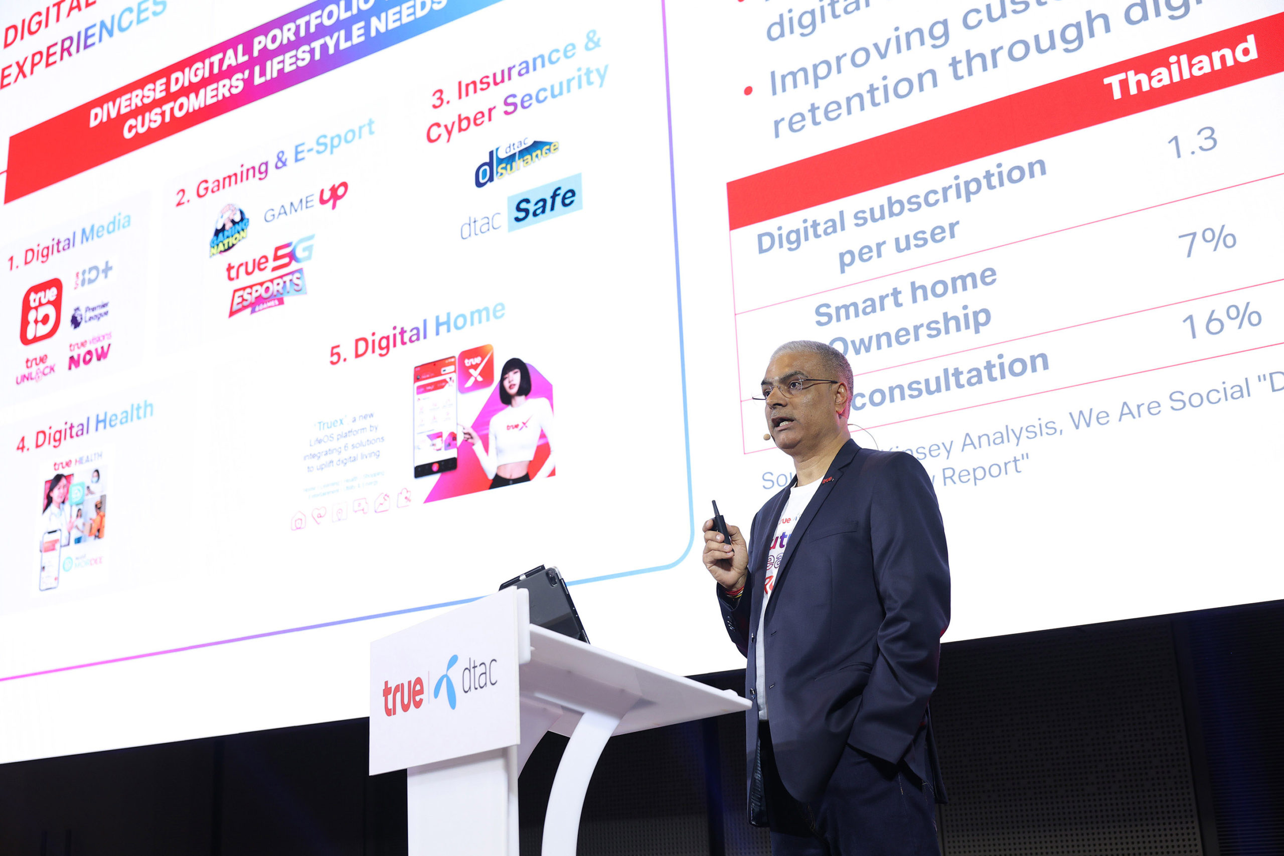 ทรู คอร์ปอเรชั่นจะมุ่งหน้าสร้างคุณค่าสำหรับลูกค้าของเราด้วยความแตกต่างด้วยข้อเสนอผลิตภันฑ์และบริการที่หลากหลายตรงความต้องการของลูกค้า โดยใช้ประโยชน์จากปัญญาประดิษฐ์ที่มีความล้ำสมัยและมีประสิทธิภาพ พร้อมกับบริการทั้งออนไลน์และออฟไลน์ด้วยประสบการณ์แบบไร้รอยต่อ ทั้งนี้ การสร้างรายได้จากบริการ 5G การใช้กลยุทธ์เพิ่มยอดขาย (Up-selling) และการเสนอขายสินค้าหรือบริการที่เกี่ยวข้อง (Cross-Selling) ด้วยข้อเสนอพิเศษ พร้อมทั้งยกระดับการให้บริการลูกค้าแบบพรีเมี่ยมด้วยบริการดิจิทัลอย่างต่อเนื่อง รวมถึงการปรับตัวของข้อเสนอในตลาดที่เกิดขึ้นอย่างต่อเนื่อง จะเป็นปัจจัยที่ส่งเสริมให้เกิดการเติบโตอย่างยั่งยืน”