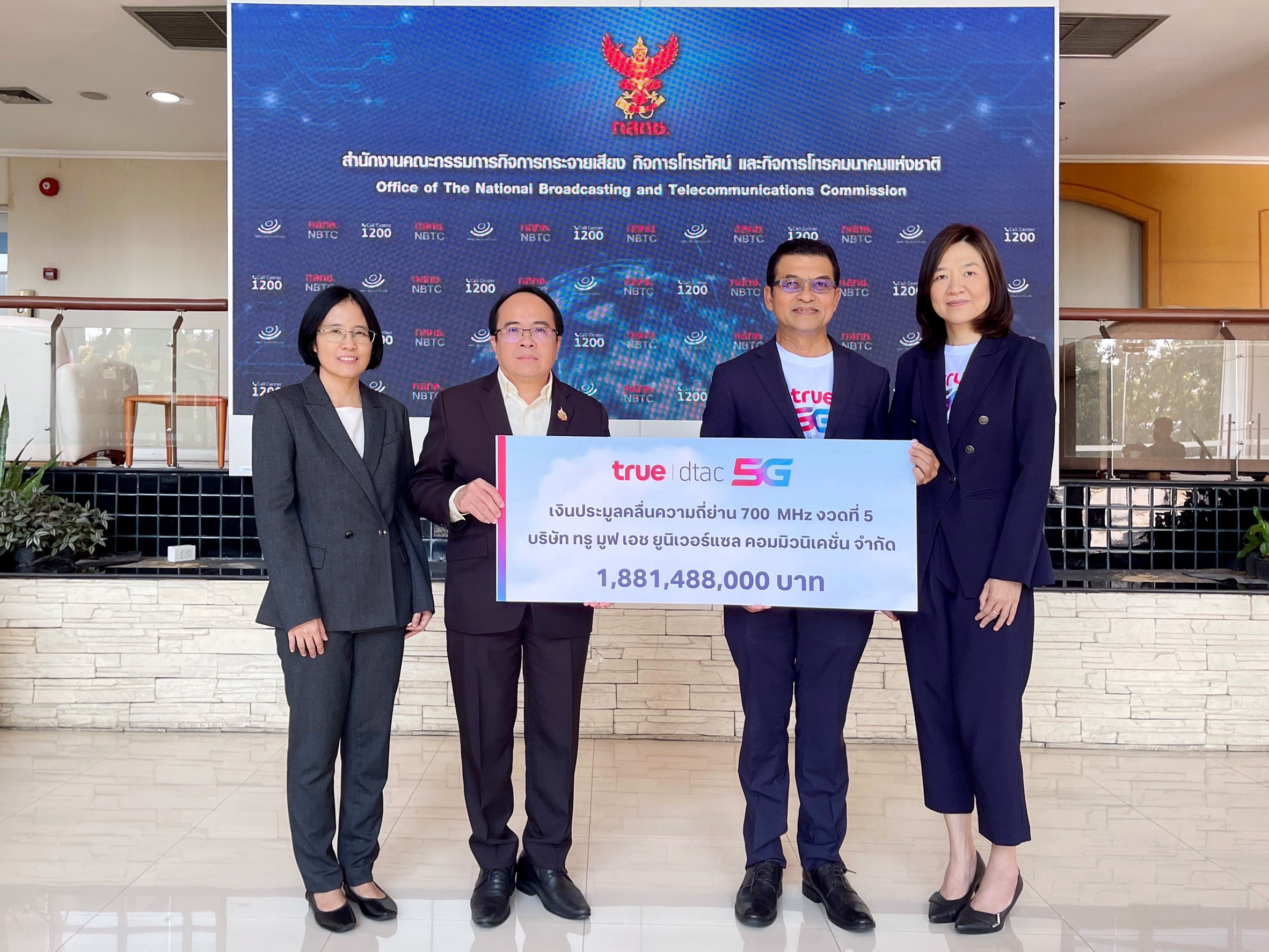 8 มกราคม 2568 – บริษัท ทรู มูฟ เอช ยูนิเวอร์แซล คอมมิวนิเคชั่น จำกัด ผู้ได้รับจัดสรรคลื่นความถี่สำหรับกิจการโทรคมนาคมย่าน 700 MHz ช่วงความถี่ 713-723 MHz คู่กับ 768-778 MHz (เดิมเป็นของบริษัท ดีแทค ไตรเน็ต จำกัด) ได้ดำเนินการชำระค่าใบอนุญาตคลื่น 700 MHz งวดที่ 5 เป็นจำนวนเงิน 1,881,488,000 บาท (รวมภาษีมูลค่าเพิ่ม) พร้อมยื่นหนังสือค้ำประกันจากสถาบันการเงินสำหรับการชำระเงินค่าคลื่นความถี่ในส่วนที่เหลือ ให้แก่สำนักงาน กสทช. ตามเงื่อนไขที่กำหนด เมื่อวันที่ 8 มกราคม 2568 โดยมีนายนฤพนธ์ รัตนสมาหาร (ที่ 3 จากซ้าย) หัวหน้าสายงานรัฐกิจสัมพันธ์และกำกับดูแล และนางสาววีณา จ่างเจริญ (ขวาสุด) ผู้เชี่ยวชาญสายงานกลยุทธ์กฎระเบียบการกำกับดูแลกิจการ บริษัท ทรู คอร์ปอเรชั่น จำกัด (มหาชน) เป็นผู้แทนบริษัทฯ ในการชำระค่าคลื่นความถี่ โดยมีนายสุทธิศักดิ์ ตันตะโยธิน (ที่ 2 จากซ้าย) รองเลขาธิการ กสทช.สายงานกิจการโทรคมนาคม เป็นผู้รับมอบ พร้อมด้วยนางพุธชาด แมนมนตรี (ซ้ายสุด) ผู้อำนวยการสำนัก สำนักการอนุญาตประกอบกิจการโทรคมนาคม 1 (ปท.1) ณ สำนักงาน กสทช.
