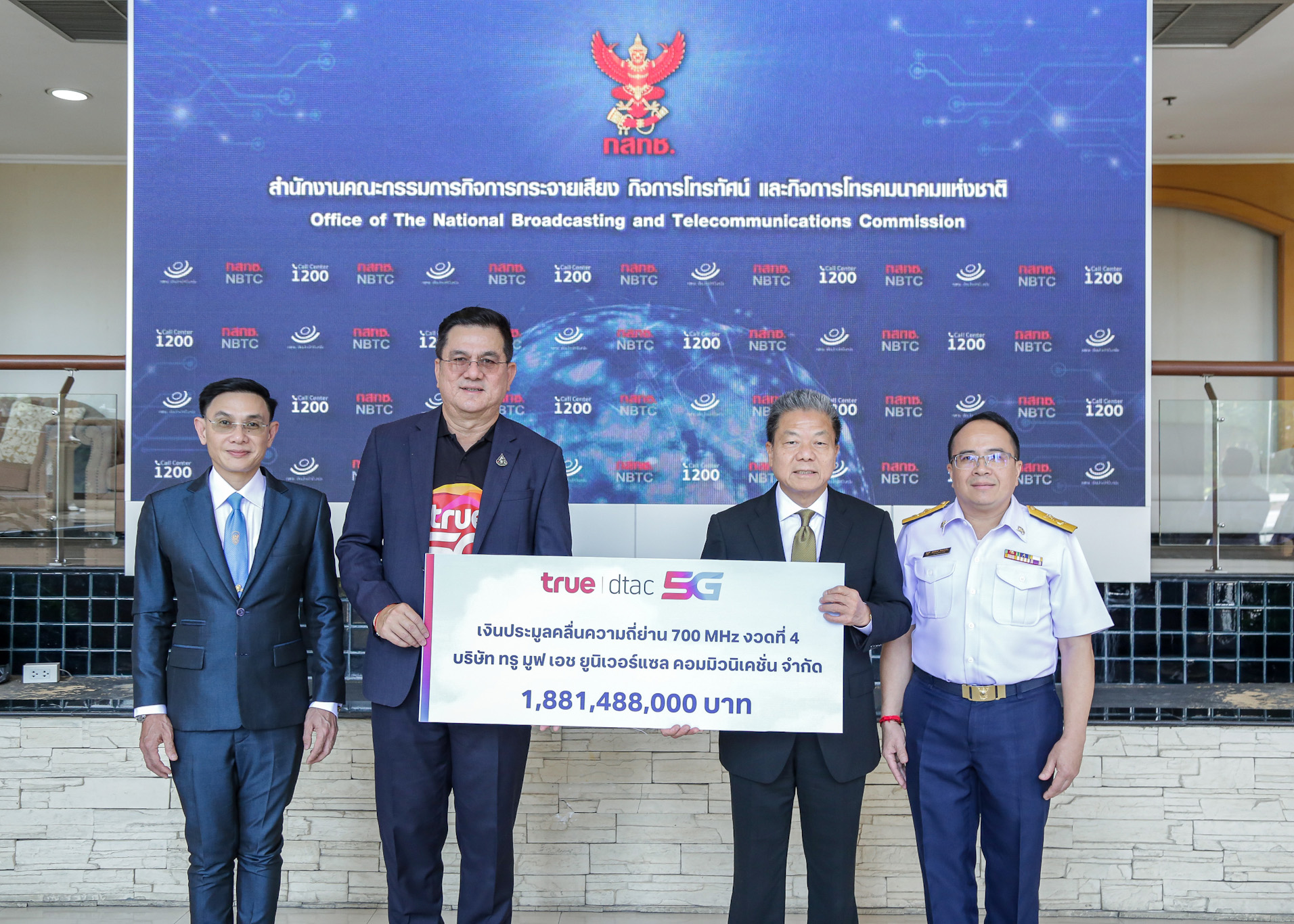 บรรยายภาพ : คุณจักรกฤษณ์ อุไรรัตน์ (ที่ 2 จากซ้าย) หัวหน้าคณะผู้บริหารด้านกิจการองค์กร และ คุณเลิศรัตน์ รตะนานุกูล (ซ้ายสุด) หัวหน้าสายงานรัฐกิจสัมพันธ์ บริษัท ทรู คอร์ปอเรชั่น จำกัด (มหาชน) ชำระค่าคลื่นความถี่ย่าน 700 MHz งวดที่ 4 โดยมี ศาสตราจารย์คลินิก นพ.สรณ บุญใบชัยพฤกษ์ (ที่ 3 จากซ้าย) ประธานกรรมการกิจการกระจายเสียง กิจการโทรทัศน์ และกิจการโทรคมนาคมแห่งชาติ และ คุณสุทธิศักดิ์ ตันตะโยธิน (ขวาสุด) รองเลขาธิการ กสทช.สายงานกิจการโทรคมนาคม เป็นผู้รับมอบ เมื่อวันที่ 8 มกราคม 2567 ที่ สำนักงาน กสทช.