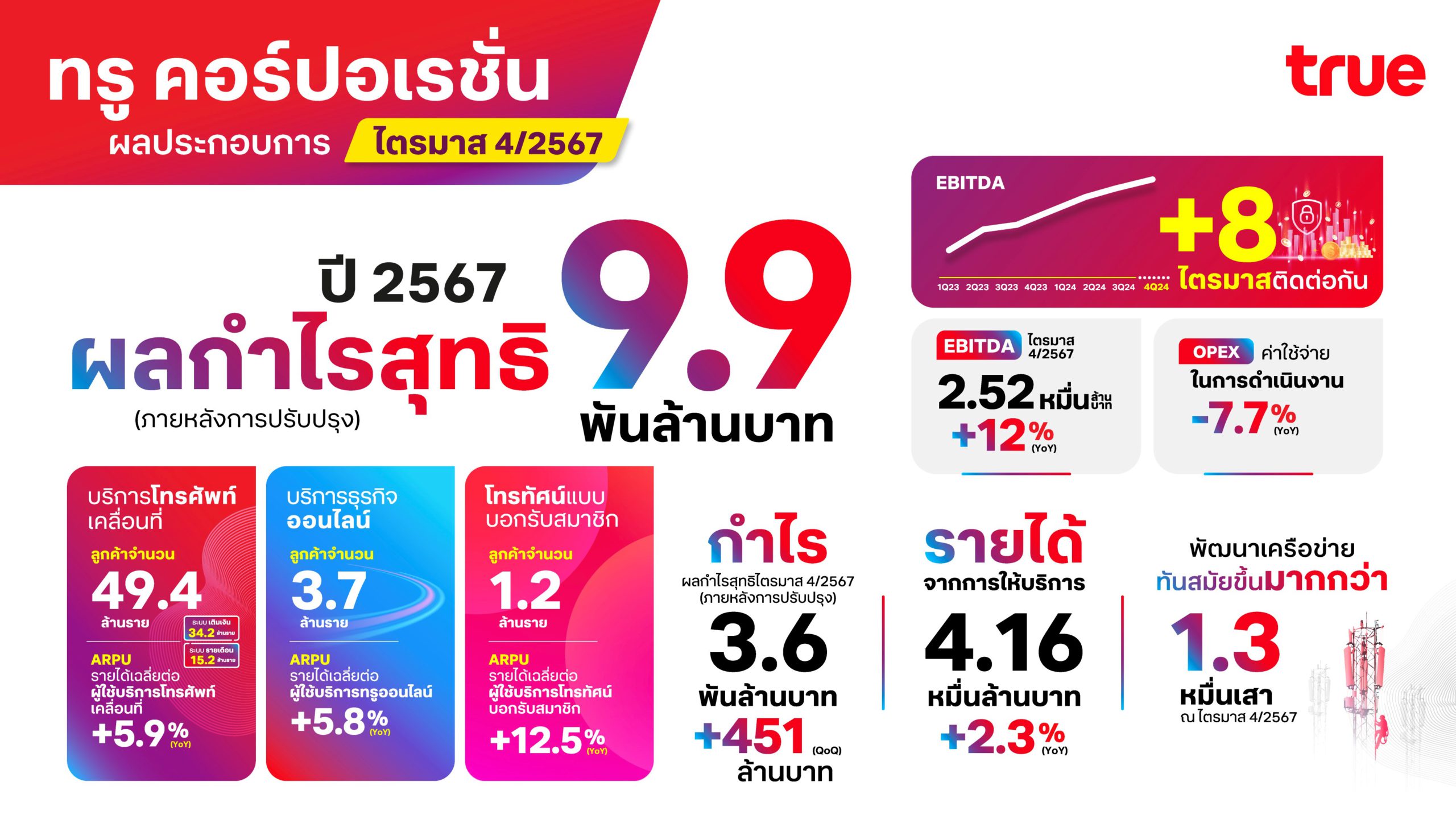 20 กุมภาพันธ์ 2568 – บริษัท ทรู คอร์ปอเรชั่น จำกัด (มหาชน) รายงานผลประกอบการไตรมาส 4/2567 สร้างกำไรต่อเนื่อง โดยมีกำไรสุทธิหลังหักภาษีและหลังปรับปรุงรายการพิเศษ (Normalized Net Profit After Tax) ที่ 3.6 พันล้านบาท โดย EBITDA เติบโตเพิ่มขึ้นเป็นไตรมาสที่ 8 ติดต่อกัน โดยมีปัจจัยหลักจากการลดลงของค่าใช้จ่ายในการดำเนินงาน จากการมุ่งเน้นผลการดำเนินงานและวินัยทางการเงิน ตลอดจนการรับรู้ผลประโยชน์จากการควบรวม (Synergy) รายได้จากการให้บริการและ EBITDA สูงกว่าแนวโน้มที่ตั้งไว้สำหรับปี 2567
