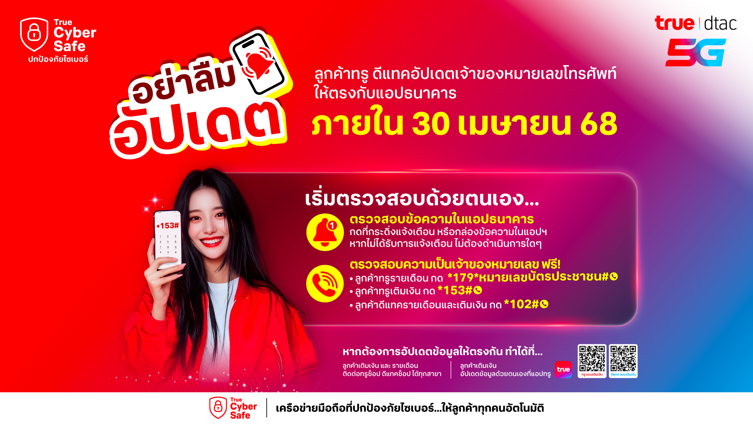 กรุงเทพฯ 22 เมษายน 2568 – ทรู นับถอยหลังการใช้งานโมบายแบงก์กิ้ง ที่กำหนดให้ชื่อเจ้าของบัญชีต้องตรงกับชื่อเจ้าของหมายเลขโทรศัพท์มือถือ ซึ่งผู้ที่จำเป็นต้องดำเนินการจะได้รับการแจ้งเตือนในกล่องข้อความของแอปธนาคาร โดยลูกค้าจะต้องติดต่อสาขาธนาคารที่สะดวก เพื่อพิสูจน์และยืนยันตัวตน พร้อมเตรียมเอกสารตามที่ธนาคารกำหนด ภายในวันที่ 30 เมษายน 2568 หรือถ้าลูกค้าต้องการอัปเดตหมายเลขโทรศัพท์ให้ตรงกับชื่อเจ้าของบัญชีโมบายแบงก์กิ้ง สามารถต่อต่อที่ทรูช้อป หรือดีแทคช้อปทุกสาขา โดยผู้จดทะเบียนซิมเดิมและใหม่ ต้องนำบัตรประชาชนตัวจริง พร้อมซิมการ์ดเลขหมายที่ต้องการเปลี่ยนชื่อผู้ใช้บริการ มาแสดงตนพร้อมกัน