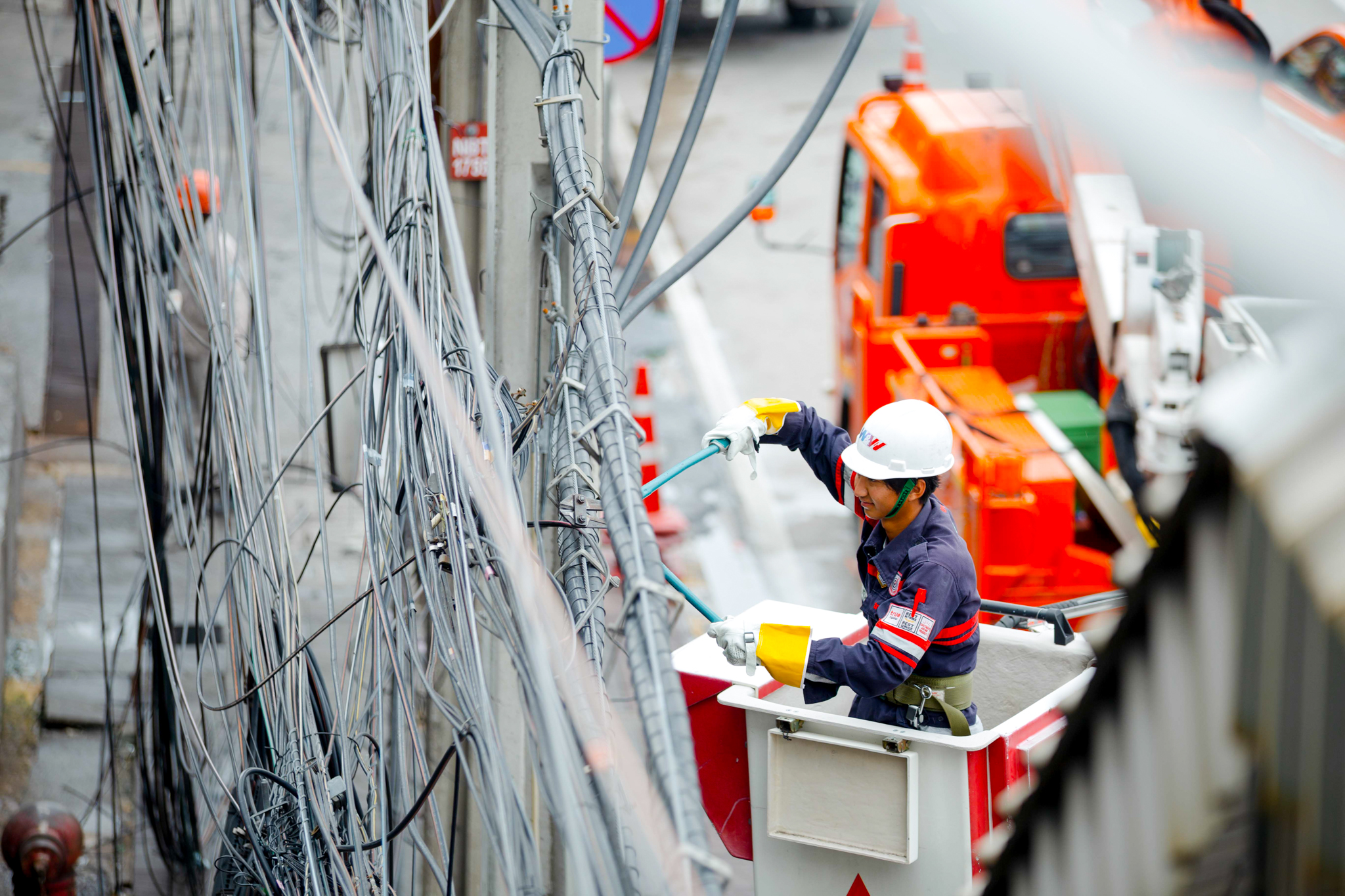 “สายสื่อสารที่เราเห็นอยู่ บนเสานั้นจึงมีทั้งสายโทรศัพท์ เดิมที่ยังไม่ได้รื้อออก และสายไฟเบอร์ซึ่งเป็นสายใหม่ที่ ให้บริการอินเทอร์เน็ตในปัจจุบั น รวมถึงสายสื่อสารของหน่ วยงานภาครัฐ เช่น สายสำหรับกล้องวรจรปิดในจุดต่ างๆ ดังนั้นสายสื่อสารที่เราเห็นว่ ามีมากมายจึงเป็นสายของผู้ ประกอบการและหน่วยงานต่างๆ รวมกว่า 10 ราย” ชญานนท์ อุดมศิลปทรัพย์ จากทีม Right of Way ของทรู ซึ่งดูแลการขออนุ ญาตใช้ท่อร้อยสายใต้ดิ นและเสาไฟฟ้า สำหรับการวางระบบโครงสร้างสายสื่ อสาร เล่าถึงที่มาของสายสื่ อสารจำนวนมากบนเสาไฟฟ้า พร้อมอธิบายต่อไว้ว่า