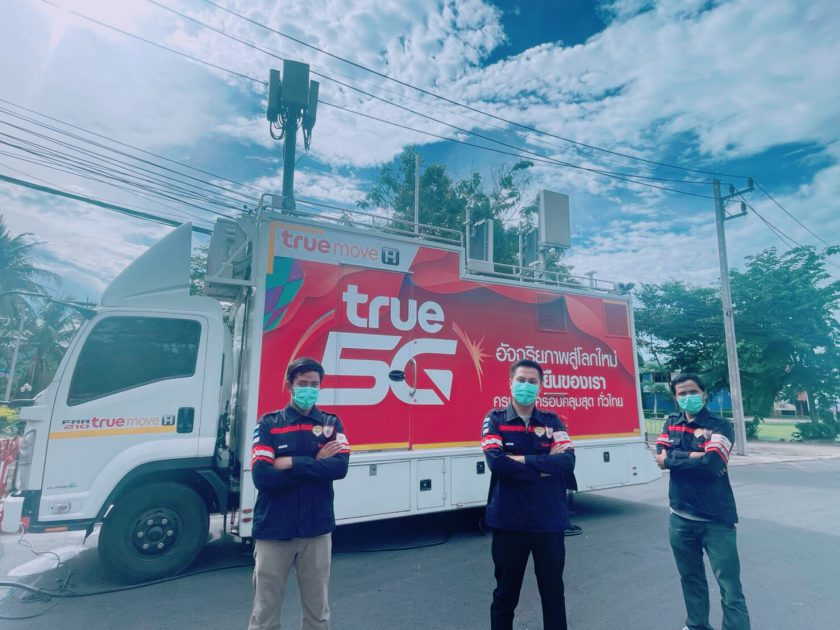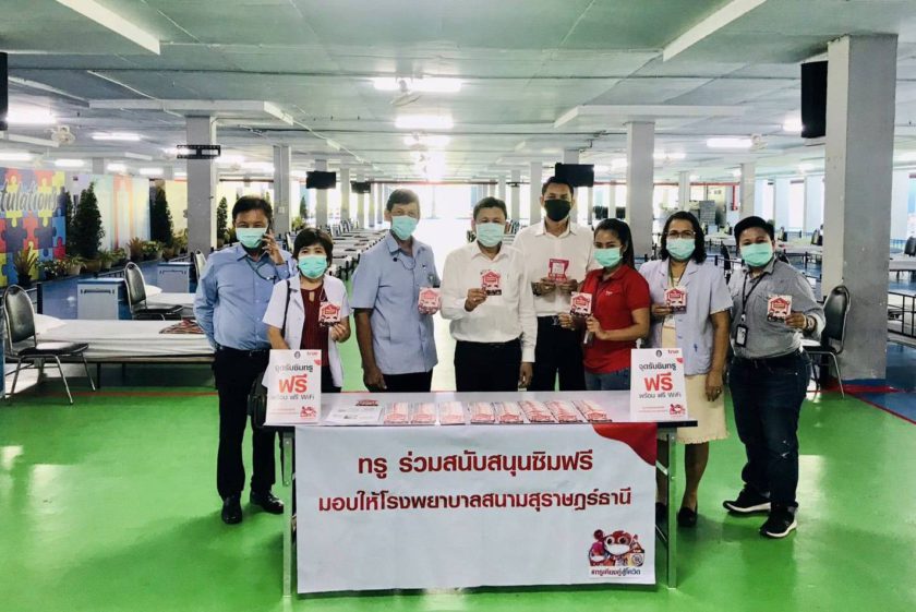 รวมพลังชาวทรู ลุยต่อเนื่อง เรื่องสื่อสาร สู้โควิดระลอก 3 โรงพยาบาลสนามสุราษฎร์ธานี โดย นายประเวศ ไทยประยูร (ที่ 5 จากขวา) รองผู้ว่าราชการจังหวัดสุราษฎร์ธานี รับมอบซิมทรูมูฟ เอช แบบเติมเงิน จำนวน 200 ซิม จากตัวแทนผู้บริหารกลุ่มทรู เพื่อสนับสนุนการทำงานของแพทย์ พยาบาล และเจ้าหน้าที่สาธารณสุขจังหวัด ตลอดจนผู้ติดเชื้อที่กักตัว ได้ใช้งาน WiFi ฟรี นาน 30 วัน นอกจากนี้ กลุ่มทรูยังส่งทีมวิศวกรลงพื้นที่ภาคใต้ติดตั้งรถโมบายล์ชุมสายเคลื่อนที่เร็ว ทรูมูฟ เอช (COW หรือ Cell-On-Wheel) เครือข่ายอัจฉริยะ True5G รวมทั้ง 4G และ WiFi ที่โรงพยาบาลสนาม ณ อาคารหอประชุม มหาวิทยาลัยราชภัฎสุราษฎร์ธานี ซึ่งจะเป็นสถานที่รองรับผู้ป่วยที่ไม่มีอาการหรือใกล้หายเป็นปกติเข้ามากักตัว โดยสามารถรองรับได้ถึง 200 เตียง เพื่ออำนวยความสะดวกด้านการสื่อสาร ให้สามารถปฏิบัติงานได้อย่างมีประสิทธิภาพ ให้ทุกการติดต่อสื่อสารเป็นไปอย่างราบรื่น ไม่สะดุด ซึ่งเป็นอีกหนึ่งความตั้งใจของกลุ่มทรูที่จะเคียงคู่คนไทยให้ชนะโควิด-19 ไปด้วยกัน