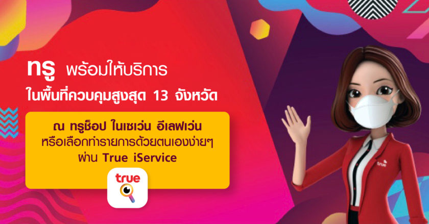 กลุ่มทรู พร้อมปฏิบัติตามข้อกำหนดในราชกิจจานุเบกษา โดยปิดให้บริการ ทรูช็อปในห้างสรรพสินค้า เพื่อลดการแพร่ระบาดของเชื้อโควิด-19 ในพื้นที่ควบคุมสูงสุด 13 จังหวัด อันประกอบด้วย กรุงเทพมหานคร ฉะเชิงเทรา ชลบุรี นครปฐม นนทบุรี นราธิวาส ปทุมธานี ปัตตานี พระนครศรีอยุธยา ยะลา สงขลา สมุทรปราการ และสมุทรสาคร เป็นการชั่วคราว แต่อย่างไรก็ตาม เพื่อให้ให้ลูกค้าคนสำคัญยังสามารถเข้าถึงบริการต่างๆ ได้อย่างต่อเนื่อง ไม่สะดุด กลุ่มทรู พร้อมอำนวยความสะดวกผ่านช่องทางอื่นๆ ดังนี้