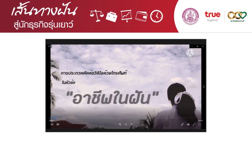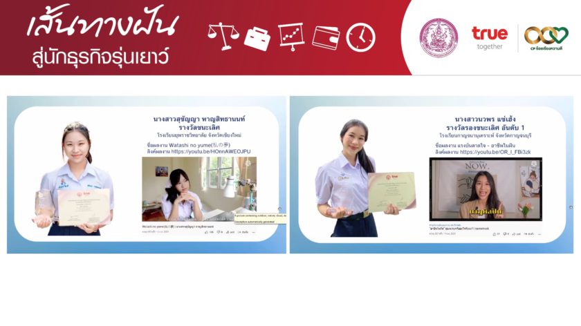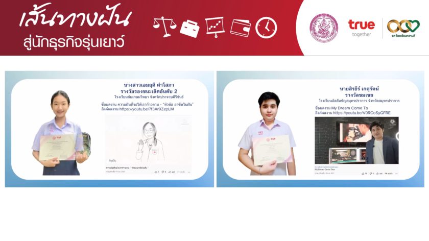 กลุ่มทรู โดย ทรูปลูกปัญญา และกรมกิจการเด็กและเยาวชน จัดให้ผู้บริหารได้ร่วมแสดงความยินดีกับน้องทั้ง 6 คนที่ได้รับรางวัลการประกวดตัดต่อวิดีโอด้วยโทรศัพท์มือถือ ในกิจกรรมเส้นทางสานฝัน สู่นักธุรกิจรุ่นเยาว์ โดยกลุ่มทรูได้จัดฝึกอบรมให้ความรู้ เกี่ยวกับการตัดต่อวิดีโอคลิป ผ่านระบบ true VROOM ให้เด็กและเยาวชนอายุระหว่าง 15 – 18 ปี ได้มีทักษะ เพิ่มโอกาสทางการศึกษาและประกอบอาชีพได้ในอนาคต มีเด็กและเยาวชนสนใจ สมัครเข้าอบรมฯ จํานวน 120 คน และร่วมส่งผลงานประกวดตัดต่อวิดีโอด้วยโทรศัพท์มือถือ หัวข้อ “อาชีพในฝัน” และได้พิจารณาคัดเลือกผลงานที่เหมาะสม ให้ได้รับรางวัลฯ ทั้ง 6 รางวัล ได้แก่
