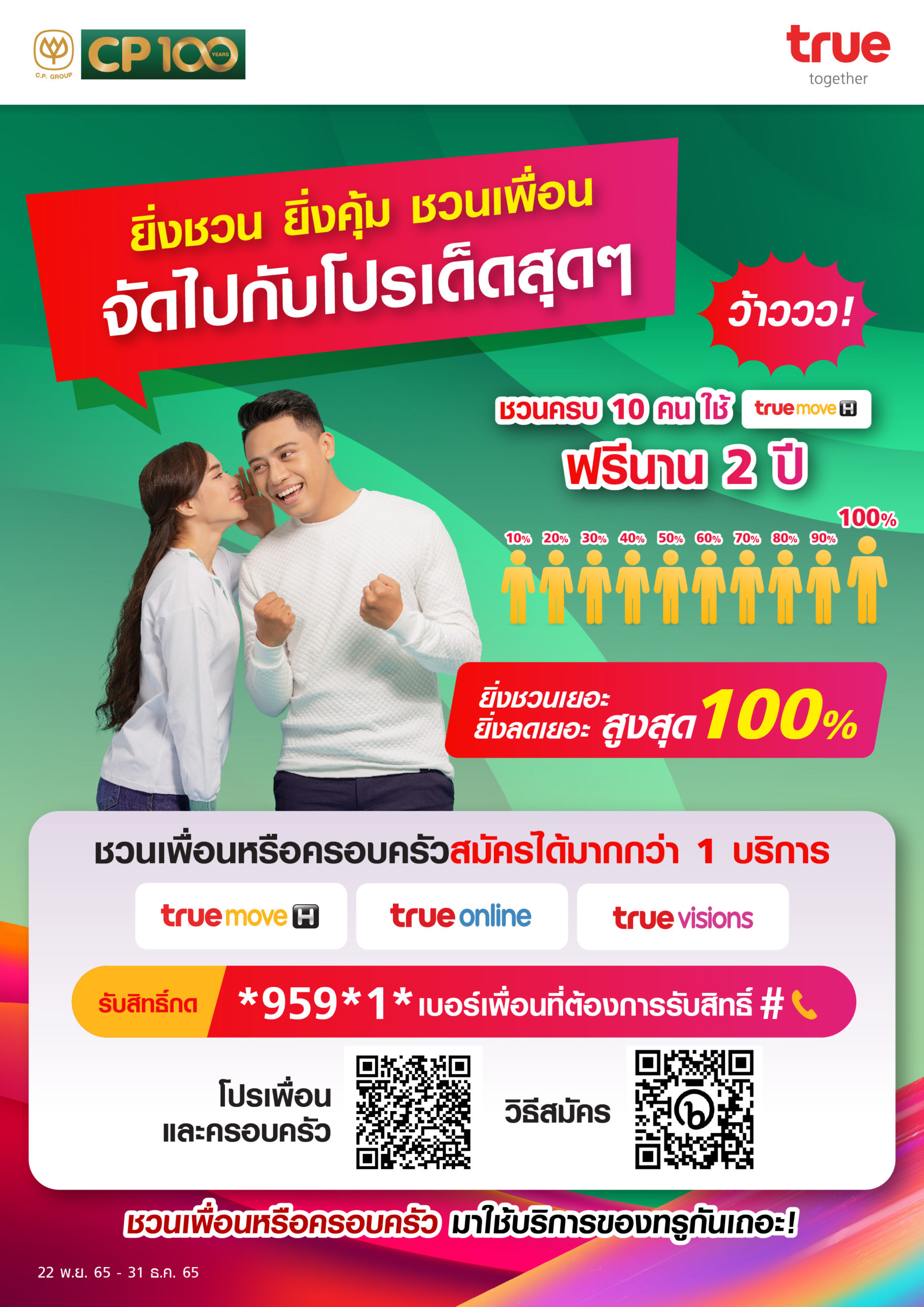 พนักงานซีพี ชวนเพื่อนและครอบครัว มาใช้ซิมทรูมูฟเอชแบบรายเดือน ทรูออนไลน์ ทรูวิชั่นส์ ทุกการแนะนำและสมัครบริการสำเร็จ รับส่วนลดค่าบริการ 10%*แนะนำสมัครครบ 10 หมายเลขบริการ ใช้งานทรูมูฟ เอช รายเดือน ฟรีไปเลย 2 ปี เพื่อนหรือครอบครัว 1 ท่าน สามารถสมัครได้มากกว่า 1 บริการ