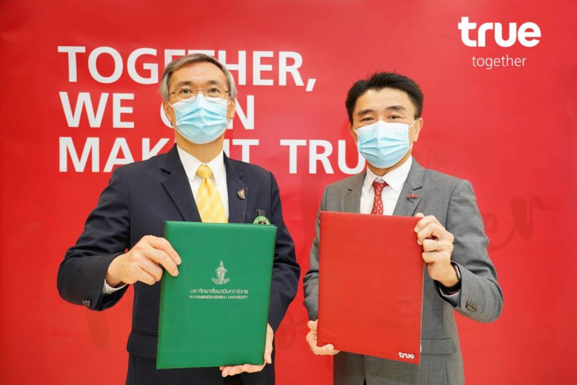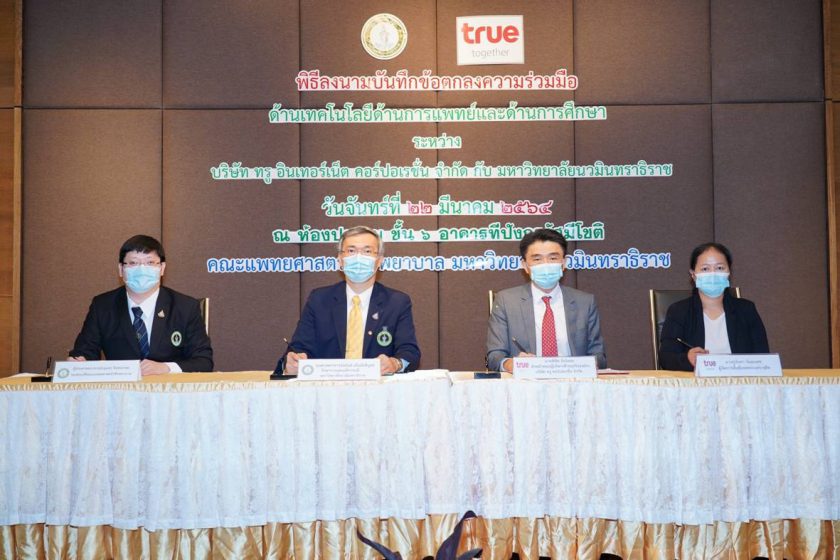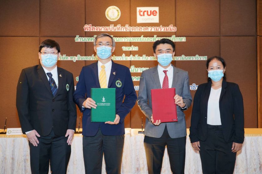 มหาวิทยาลัยนวมินทราธิราช โดยรองศาสตราจารย์นายแพทย์อนันต์ มโนมัยพิบูลย์ (ที่ 2 จากซ้าย) รักษาการแทนอธิการบดี และ ผู้ช่วยศาสตราจารย์นายแพทย์อนุแสง จิตสมเกษม (ซ้ายสุด)รองคณบดีคณะแพทยศาสตร์วชิรพยาบาล ร่วมกับ กลุ่มทรู โดย นายพิชิต ธันโยดม (ที่ 2 จากขวา)หัวหน้าคณะผู้บริหารด้านธุรกิจองค์กร และนางสุนันทา รัมมะเดช (ขวาสุด) ผู้จัดการพื้นที่เขตพระนคร-ดุสิต ลงนามบันทึกข้อตกลงความร่วมมือพัฒนาบริการโทรคมนาคมและเทคโนโลยีดิจิทัลด้านต่างๆ เตรียมพร้อมก้าวเข้าสู่ “สมาร์ทฮอสปิทัล” เพื่อให้เกิดประโยชน์สูงสุดในด้านการแพทย์และการศึกษาแบบครบวงจร โดยการสนับสนุนการติดตั้งสถานีฐานรับ-ส่งสัญญาณโทรศัพท์เคลื่อนที่4G/5G ตลอดจนติดตั้งระบบสื่อสารข้อมูลแบบไร้สาย WiFi by TrueMove H ภายในมหาวิทยาลัยนวมินทราธิราชและโรงพยาบาลวชิรพยาบาล เพื่อรองรับการใช้งานของบุคลากรทางการแพทย์ และเจ้าหน้าที่ ตลอดจนผู้มาใช้บริการของโรงพยาบาลฯ