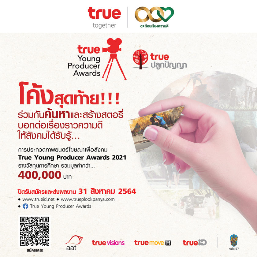 หยิบความดีที่ไม่มีใครเห็น มาเป็นแบบอย่าง สร้างสรรค์โลกให้น่าอยู่…..ทรูปลูกปัญญา ร่วมกับ สมาคมโฆษณาแห่งประเทศไทย พร้อมด้วยทรูวิชั่นส์ ทรูไอดี และทรูมูฟเอชเชิญชวนเยาวชนไทยค้นหาเรื่องราวการทำความดี ไม่ว่าจะเป็นเรื่องเล็ก หรือเรื่องใหญ่ มาปั้นให้เป็นภาพยนตร์โฆษณา เพื่อส่งต่อให้สังคมได้รับรู้ สร้างการเปลี่ยนแปลงให้กับสังคม พร้อมเชิดชูความดีให้คนอยากทำความดีมากยิ่งขึ้น ในโครงการประกวดภาพยนตร์โฆษณาเพื่อสังคม True Young Producer Awards 2021 ครั้งที่ 17 ถ้วยพระราชทานสมเด็จพระกนิษฐาธิราชเจ้า กรมสมเด็จพระเทพรัตนราชสุดา ฯ สยามบรมราชกุมารี ในหัวข้อ ‘ความดีที่ไม่มีใครรู้ แชร์ให้รู้ว่ามี’ ชิงทุนการศึกษา รวมมูลค่ากว่า 400,000 บาท