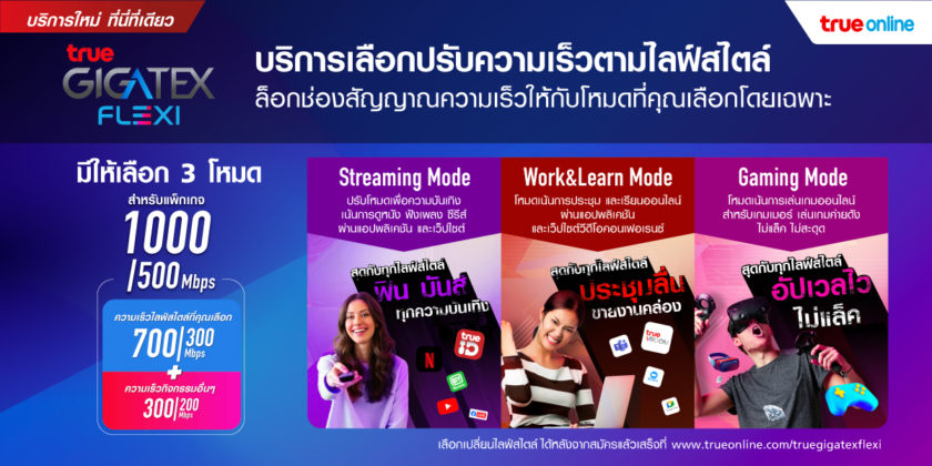นายธนภูมิ ภาคย์วิศาล ผู้อำนวยการและหัวหน้าสายงานการพาณิชย์ทรูออนไลน์ บมจ.ทรู คอร์ปอเรชั่น กล่าวว่า “ทรูออนไลน์ ในฐานะผู้นำเน็ตบ้านไฟเบอร์ 1Gbps ตัวจริง มุ่งมั่นพัฒนาเทคโนโลยีสินค้าและบริการมาอย่างต่อเนื่อง จึงเข้าใจพฤติกรรมการใช้งานของลูกค้าที่เปลี่ยนไป ได้เป็นอย่างดี และพร้อมที่จะร่วมยกระดับประสบการณ์ใหม่ที่ดียิ่งขึ้นให้ลูกค้าชาวไทย ในฐานะผู้นำตลาดที่ไม่เคยหยุดนิ่ง จึงได้พัฒนานวัตกรรมที่แตกต่างและหลากหลาย โดยล่าสุดทรูออนไลน์เป็นรายแรกในไทย นำนวัตกรรมบริการ True Gigatex Flexi ที่ให้สมาชิกในบ้านสามารถปรับความเร็วตามไลฟ์สไตล์ได้ด้วยตัวเอง ผ่าน www.trueonline.com/truegigatexflexi โดยมีให้เลือกปรับได้ 3 รูปแบบ ไม่ว่าจะเป็นโหมดการทำงานหรือเรียนออนไลน์ (Work &Learn) เพื่อเน้นการประชุม หรือเรียนออนไลน์ ผ่านแอปพลิเคชันวีดีโอคอนเฟอเรนซ์ต่างๆ, โหมดเน้นใช้งานเพื่อความบันเทิง ดูหนังฟังเพลง (Streaming) เพื่อเน้นการใช้เน็ตเพื่อดูหนัง ซีรีส์ แอปพลิเคชันคอนเทนต์สตรีมมิ่งยอดนิยม หรือ โหมดเน้นการเล่นเกม (Gaming) สำหรับคอเกมเมอร์ เล่นเกมฮิตจากค่ายดังที่ต้องใช้แบนด์วิธสูงๆ ได้อย่างไม่มีสะดุด เพื่อให้เกิดประโยชน์สูงสุดแก่การใช้งานในแต่ละประเภทของสมาชิกในบ้าน ซึ่ง True Gigatex Flexi เปิดให้บริการทั้งลูกค้าปัจจุบัน และลูกค้าใหม่ ที่ใช้แพ็กเกจความเร็วที่ 1,000/500 Mbps ขึ้นไป โดยเทคโนโลยีจะทำการล็อกแยกช่องสัญญาณแบนด์วิธให้กว้างขึ้น เพื่อเน้นรองรับการใช้งานตามโหมดที่เลือกให้เป็น 700/300Mbps และแยกแบนด์วิธไว้เผื่อกิจกรรมอื่นๆอีก 300/200Mbps สำหรับลูกค้าปัจจุบันที่ใช้ความเร็วต่ำกว่า 1000/500 Mbps สามารถสมัครบริการเสริมเพิ่มสปีด speed boost เพิ่มได้ เริ่มเพียงเดือนละ 99 บาท หรือ สามารถทดลองใช้บริการใหม่นี้ได้ง่ายๆเพียงใช้ 10 ทรูพอยท์ แลกเพิ่มความเร็วเป็น 1000/500Mbps (ใช้งานได้ 7 วัน) ได้ที่แอปพลิเคชันทรูไอดี