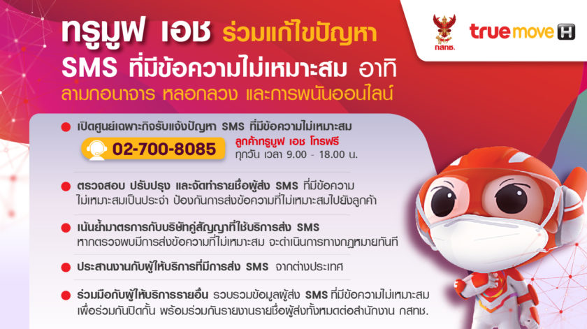 ทรูมูฟ เอช ร่วมแก้ไขปัญหา SMS ที่มีเนื้อหาไม่เหมาะสม ลามกอนาจาร หลอกลวง และการพนันออนไลน์ พร้อมขานรับแนวทางของกสทช. ย้ำบริษัทฯ พร้อมดำเนินการปิดกั้นการส่ง SMS ที่มีข้อความไม่เหมาะสม และเคร่งครัดกับบริษัทคู่สัญญาที่ใช้บริการส่ง SMS ผ่านเครือข่ายของบริษัทฯ มาโดยตลอด โดยเร่งเดินหน้าเปิดศูนย์เฉพาะกิจรับแจ้งปัญหา SMS ที่มีข้อความไม่เหมาะสมผ่านหมายเลขพิเศษ โทร 02 700 8085 (ลูกค้าทรูมูฟ เอช โทรฟรี) เพื่อตรวจสอบและดำเนินการปิดกั้นข้อความที่ไม่เหมาะสม ตลอดจนแจ้งย้ำเตือนบริษัทคู่สัญญาที่ใช้บริการส่ง SMS ผ่านเครือข่ายทรูมูฟ เอช หากตรวจพบมีการส่งข้อความที่ไม่เหมาะสม ทรูมูฟ เอช จะดำเนินการทางกฎหมายทันที ซึ่งครอบคลุมถึง SMS ที่ส่งจากผู้ให้บริการในต่างประเทศด้วย อีกทั้งบริษัทจะร่วมมือกับผู้ให้บริการรายอื่นในการรวบรวมรายชื่อผู้ส่ง SMS ที่ไม่เหมาะสม (Blacklist) และร่วมกันปิดกั้น SMS ในลักษณะดังกล่าว พร้อมรายงานต่อสำนักงาน กสทช. เพื่อให้ผู้บริโภคชาวไทยได้ใช้บริการที่สะดวกและปลอดภัยที่สุด