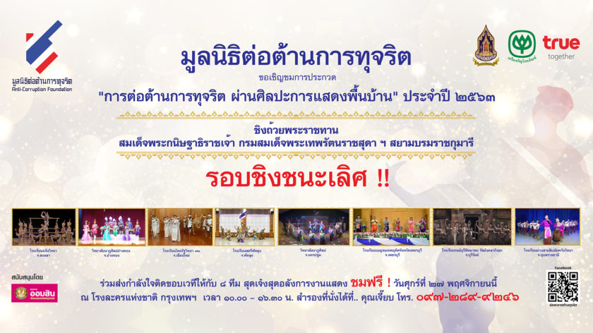 มูลนิธิต่อต้านการทุจริต ร่วมกับ กระทรวงวัฒนธรรม เครือเจริญโภคภัณฑ์ และกลุ่มทรู เชิญชมการประกวดรอบชิงชนะเลิศ “การต่อต้านการทุจริตผ่านศิลปะการแสดงพื้นบ้าน” ประจำปี 2563 ชิงถ้วยพระราชทาน สมเด็จพระกนิษฐาธิราชเจ้า กรมสมเด็จพระเทพรัตนราชสุดาฯ สยามบรมราชกุมารี พร้อมทุนการศึกษากว่า 600,000 บาท ร่วมเชียร์และส่งกำลังใจแบบติดขอบเวทีให้ 8 ทีมสุดท้าย คือ