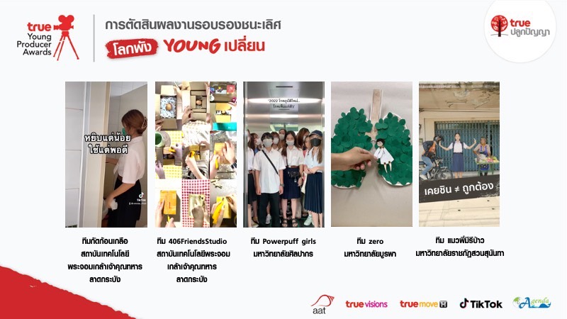 22 พฤศจิกายน 65 – กลุ่มทรู โดยทรูปลูกปัญญา นำโดย คุณประพาฬพงษ์ มากนวล รองผู้อำนวยการฝ่ายกิจกรรมองค์กรเพื่อสังคม ร่วมกับสมาคมโฆษณาแห่งประเทศไทย โดย คุณอดิศักดิ์ อมรฉัตร เลขาธิการฯ ร่วมด้วย อาจารย์บรรยงค์ สุวรรณผ่อง ประธานกรรมการจริยธรรมวิชาชีพ สมาคมนักข่าววิทยุและโทรทัศน์ และมูลนิธิ Earth Agenda Foundation โดย ศ.สพญ.ดร.นันทริกา ชันซื่อ ประธานมูลนิธิฯ พร้อมด้วยคณะกรรมการผู้ทรงคุณวุฒิ ร่วมคัดเลือกผลงาน และแสดงความยินดีกับ 11 ทีมสุดท้าย ที่ผ่านเข้าสู่รอบชิงชนะเลิศ ในโครงการประกวดภาพยนตร์โฆษณาเพื่อสังคม ชิงถ้วยพระราชทานสมเด็จพระกนิษฐาธิราชเจ้า กรมสมเด็จพระเทพรัตนราชสุดา ฯ สยามบรมราชกุมารี ครั้งที่ 18 True Young Producer Awards 2022 หัวข้อ ‘โลกพัง Young เปลี่ยน’ และทุนการศึกษา รวมมูลค่ากว่า 430,000 บาท