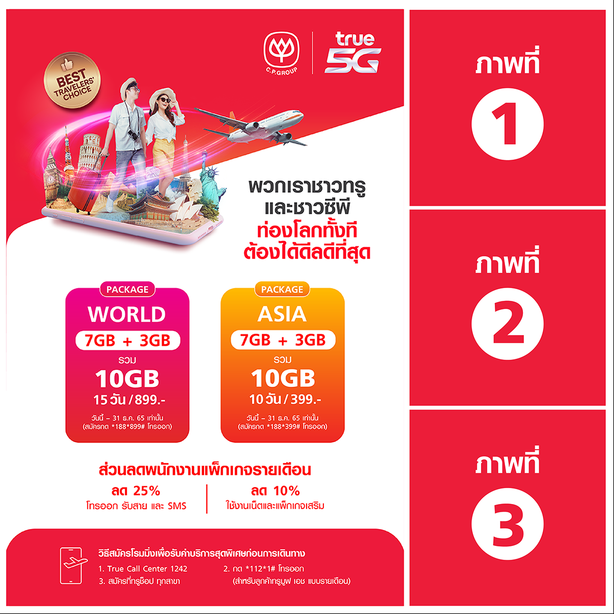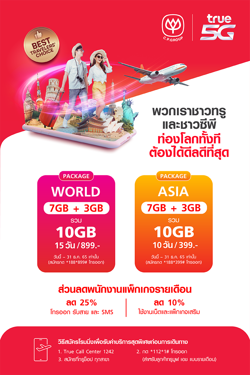 ใช้แพ็กเกจรายเดือนรับส่วนลดค่าบริการโรมมิ่งสูงสุด 25% ทั้งการใช้เบอร์ทรูในต่างประเทศและ TRUE TRAVEL SIM พร้อมกับของรางวัลอีกมากมาย
