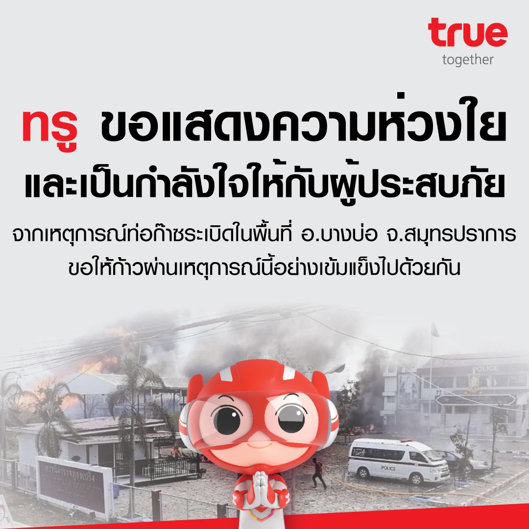 กลุ่มทรู ได้ลงพื้นที่ส่งมอบอาหารแห้ง น้ำดื่ม ไข่ไก่ พร้อมร่วมเป็นกำลังใจให้แก่ครอบครัวผู้ประสบภัย ซึ่งผู้แทนกลุ่มทรู นำโดย คุณทวนทอง ศรีวิเชียร ผู้อำนวยการด้านการบริหารจัดการระดับภูมิภาคพื้นที่กรุงเทพตะวันออกเฉียงใต้และจังหวัดสมุทรปราการ รวมทั้ง คุณปุนญาภา ก้อนสันทัด ผู้จัดการเขตพื้นที่บางบ่อ-บางเสาธง พร้อมด้วยทีมงานทรู และทีม CP Freshmart ได้ลงพื้นที่ส่งมอบแก่กองสวัสดิการสังคม โดยคุณธวันรัตน์ แสงจำปา ผู้อำนวยการ ทั้งนี้ กลุ่มทรู ขอแสดงความห่วงใยและเป็นกำลังใจให้แก่ผู้ได้รับผลกระทบและครอบครัว ก้าวผ่านเหตุการณ์ครั้งนี้อย่างเข้มแข็งไปด้วยกัน