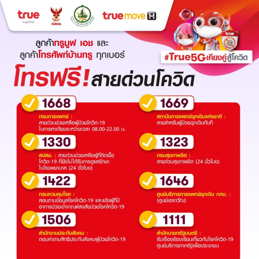 ด้วยความเข้าใจถึงความจำเป็นเร่งด่วน และความตึงเครียดของพี่น้องชาวไทยในช่วงการแพร่ระบาดและการติดเชื้อโควิด-19…กระทรวงดิจิทัลเพื่อเศรษฐกิจและสังคม (ดีอีเอส) สำนักงานคณะกรรมการกิจการกระจายเสียง กิจการโทรทัศน์ และกิจการโทรคมนาคมแห่งชาติ (กสทช.) และกลุ่มทรู มีความห่วงใย และต้องการให้ประชาชาชน สามารถเข้าถึงความช่วยเหลือ หรือรับคำปรึกษาได้อย่างรวดเร็ว และไม่ต้องกังวลเรื่องค่าใช้จ่ายในการติดต่อสื่อสาร จึงได้เปิดให้ลูกค้าทรูมูฟ เอช และลูกค้าโทรศัพท์บ้านทรู ทุกเบอร์ โทรฟรี สายด่วนโควิด ดังนี้