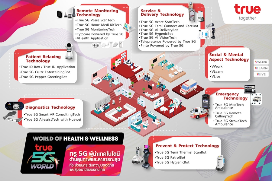 เทคโนโลยีที่มาพร้อมความอัจฉริยะแบบครบวงจรครั้งนี้ เริ่มเข้ามาสู่วิถีการใช้ชีวิตจริงของคนไทย สะท้อนได้จากหลากหลายโครงการที่ทาง ทรู ได้ลงมือปฏิบัติจริง เห็นได้อย่างชัดเจนแม้กระทั่งในช่วงวิกฤตที่ผ่านมา กับ “True 5G World of Health & Wellness”