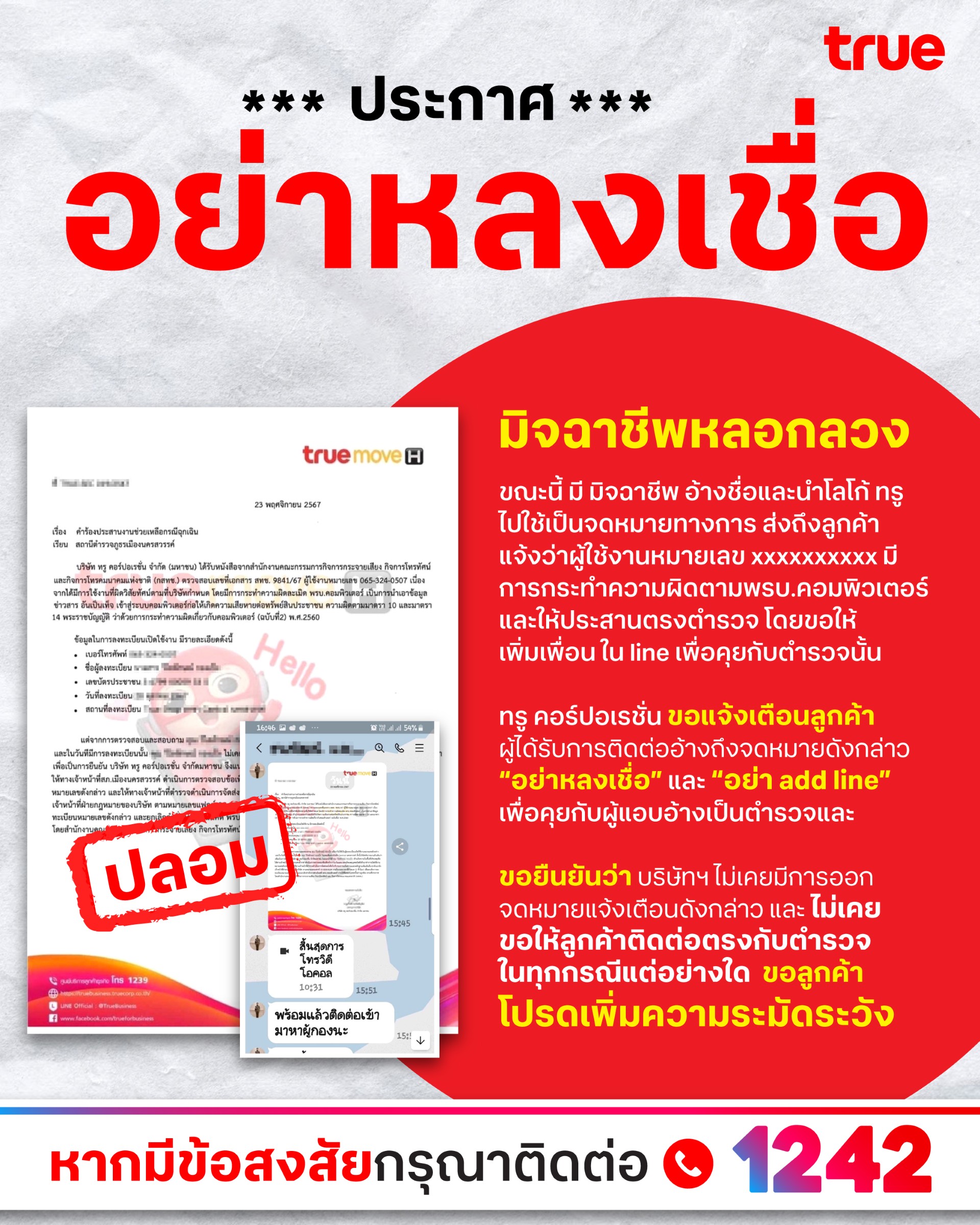 ทรู คอร์ปอเรชั่น ขอยืนยันว่าบริษัทฯ ไม่เคยมีการออกจดหมายแจ้งเตือนดังกล่าว และไม่เคยขอให้ลูกค้าติดต่อตรงกับตำรวจในทุกกรณีแต่อย่างใด ขอลูกค้าโปรดเพิ่มความระมัดระวัง หากมีข้อสงสัยกรุณาติดต่อกลับ 1242