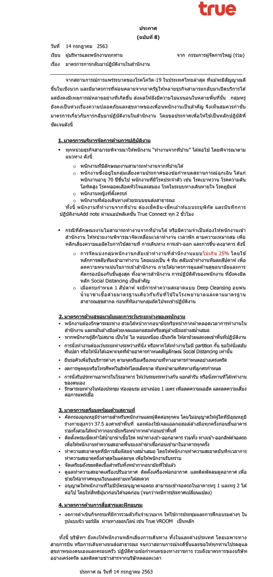 เมื่อวันที่ 14 กรกฎาคม 2563 กลุ่มทรูได้ออกประกาศมาตรการป้องกันและเฝ้าระวังการระบาดของโควิด-19 เพิ่มเป็นฉบับที่ 8 ว่าด้วยมาตรการการกลับมาปฏิบัติงานในสำนักงาน ทั้งนี้แม้ว่าสถานการณ์การแพร่ระบาดจะมีสัญญานดีขึ้นแต่ก็ยังมีเหตุการณ์หลายอย่างที่เกิดขึ้นส่งผลให้มีความไม่แน่นอนในหลายพื้นที่ กลุ่มทรูยังคงห่วงใยเรื่องความปลอดภัยและสุขภาพของเพื่อนพนักงานเป็นสำคัญ จึงขอให้พนักงานยึดหลัปฏิบัตื 4 เรื่องได้แก่ 1.บริหารจัดการด้านการปฏิบัติงาน 2.มาตรการด้านสุขอนามัยและการเว้นระยะห่างของพนักงาน 3.มาตรการเตรียมพร้อมด้านสถานที่ 4.มาตรการด้านการสื่อสารและฝึกอบรม โดยมีรายละเอียดดังนี้