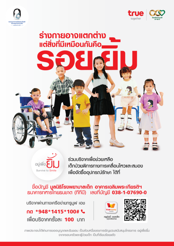 กรุงเทพฯ 29 มีนาคม 2565 – ร่างกายที่แตกต่าง แต่สิ่งที่เหมือนกันคือรอยยิ้ม…กลุ่มทรู ร่วมกับกองทุนอาคารเฉลิมพระเกียรติฯ มูลนิธิโรงพยาบาลเด็ก เชิญชวนคนไทยและลูกค้ากลุ่มทรู ร่วมบริจาคสมทบทุนในโครงการ “อยู่เพื่อยิ้ม” Survive to Smile เพื่อจัดซื้ออุปกรณ์เทคโนโลยีระดับสูง สำหรับวินิจฉัย รักษาและผ่าตัดแก้ไขความพิการทางการเคลื่อนไหวและสมอง พร้อมฟื้นฟูสภาวะร่างกายที่ซับซ้อน อันจะช่วยเติมเต็มศักยภาพรวมถึงความปลอดภัยจากภาวะแทรกซ้อนแก่กลุ่มผู้ป่วยเด็กได้